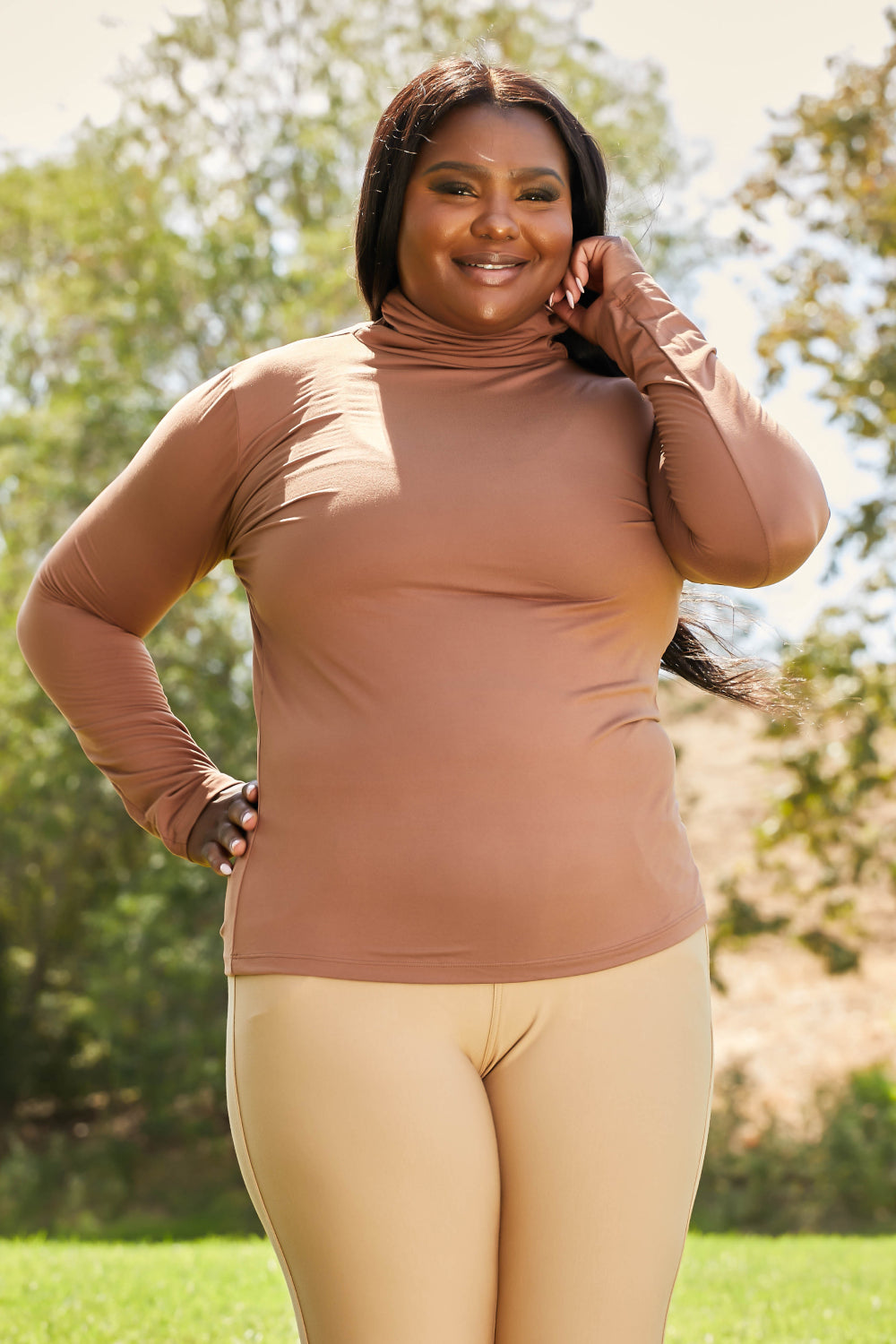Models are wearing sizes S and 1X, showcasing the top's versatility across different body shapes. This turtleneck is designed to flatter all figures, ensuring that everyone can enjoy its luxurious feel and stylish appearance.