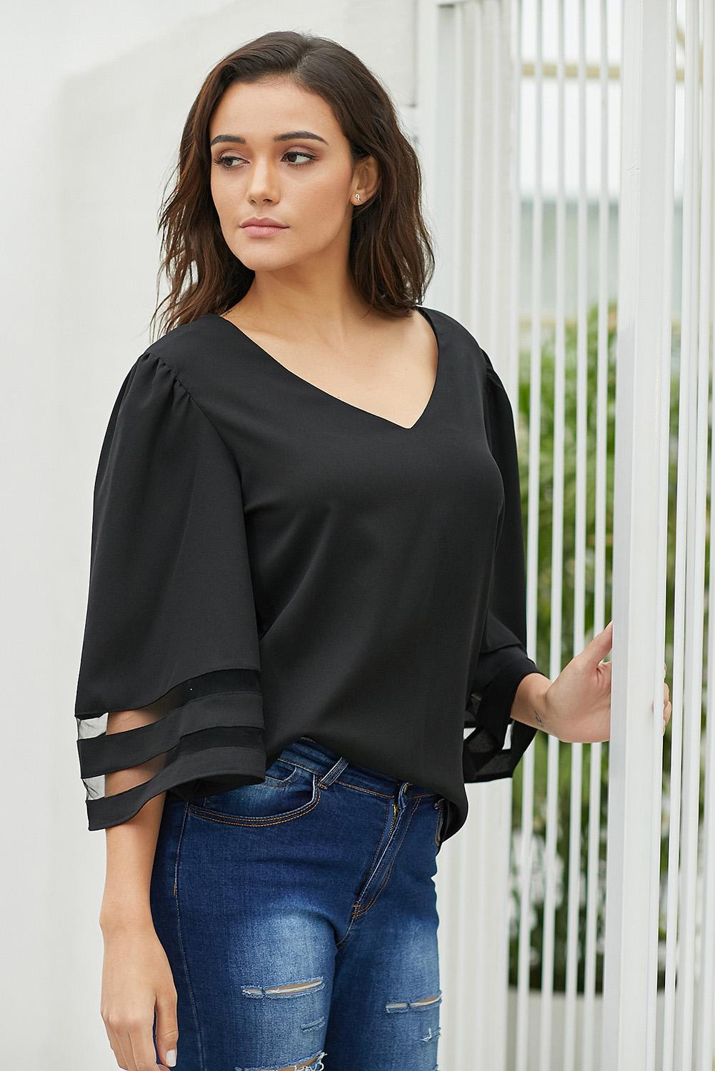 Introducing the Black Flare Sleeve V Neck Loose Women's Chiffon Blouse, a must-have addition to your summer wardrobe. This blouse combines style and comfort, making it perfect for various occasions. The sexy v-neck design and 3/4 length flare sleeves with sheer inserts add a touch of elegance, while the pullover style ensures a relaxing fit for all body types. Whether you're heading out for a casual lunch or a summer evening gathering, this blouse is versatile enough to pair with jeans, casual pants, or skirts.