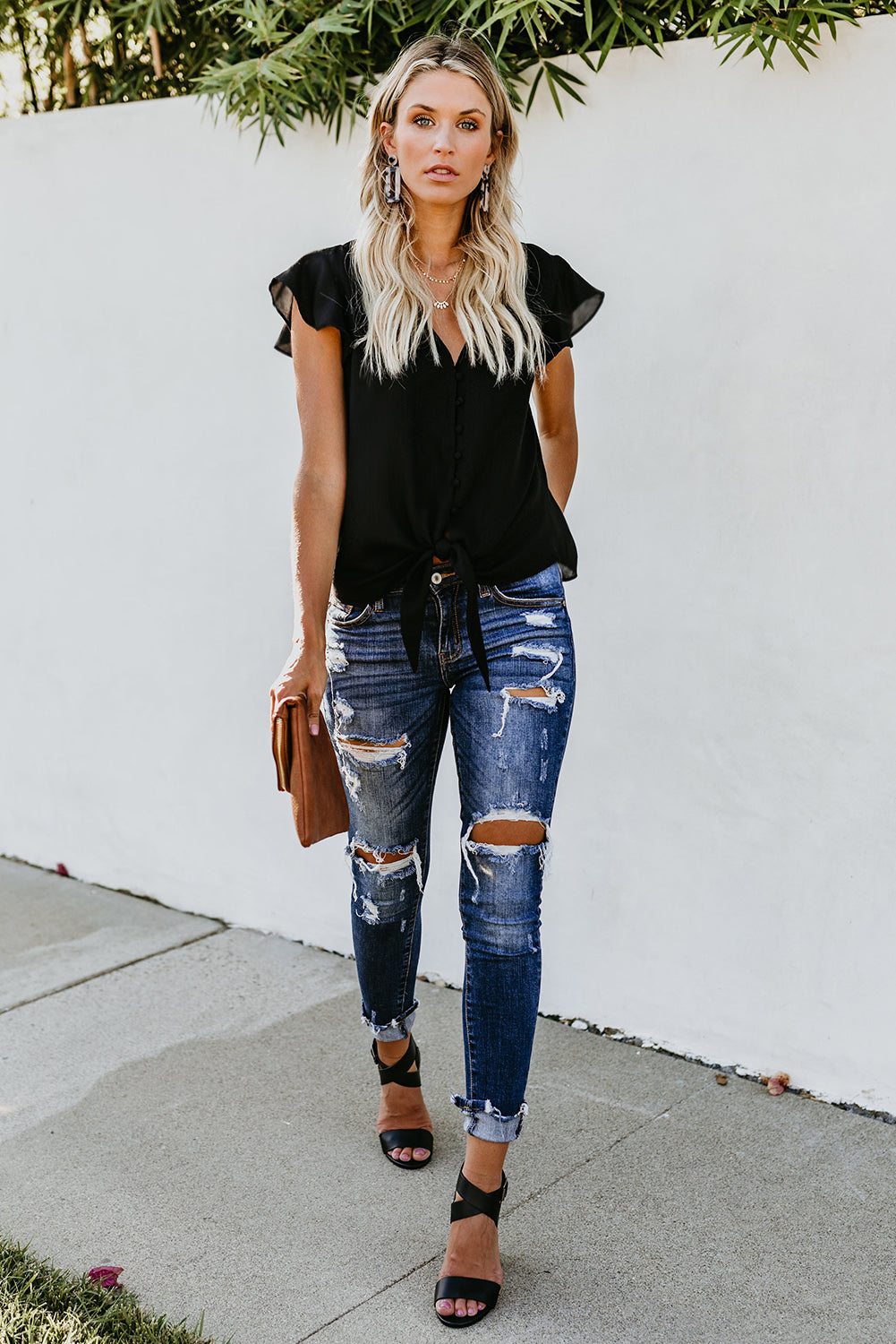 A stylish black button-down tie top featuring a deep V-neckline and fluttering short sleeves, perfect for summer wear.
