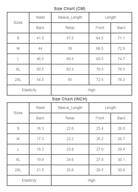 | Size | Waist (inches) | Sleeve Length (inches) | Length (Front) (inches) | Length (Back) (inches) |