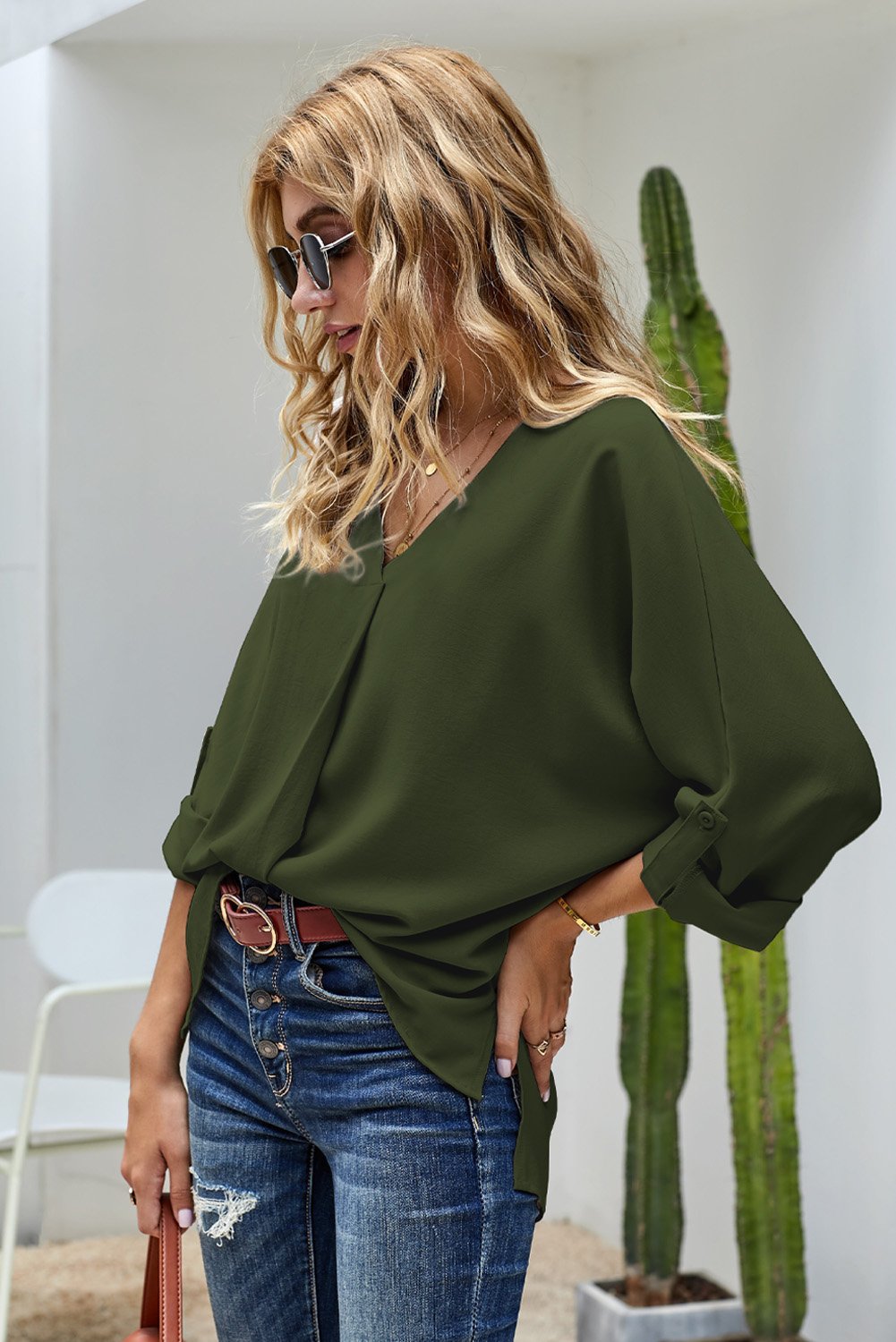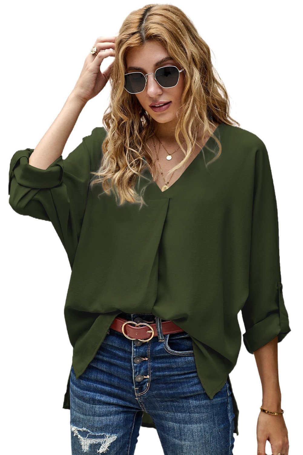Introducing our Elegant Army Green V Neck 3/4 Sleeve High Low Hem Blouse, a must-have addition to your wardrobe. This blouse combines comfort and style, making it perfect for casual outings during spring and autumn. Crafted from a soft, lightweight fabric, it feels delightful against the skin, ensuring you won't want to take it off.