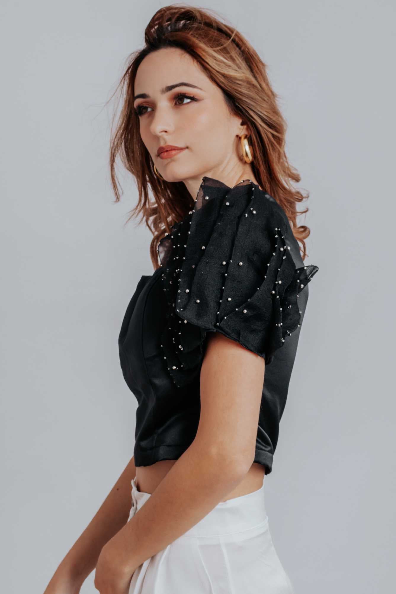 This top is incredibly versatile and can be styled in numerous ways. Pair it with tailored pants for a polished look, or dress it down with your favorite jeans for a more casual vibe. The Fiona Ruffle Puff Pleated Sleeves Top also looks stunning with a skirt, making it perfect for a variety of occasions. Complete your outfit with open toe heels to elevate your style even further.