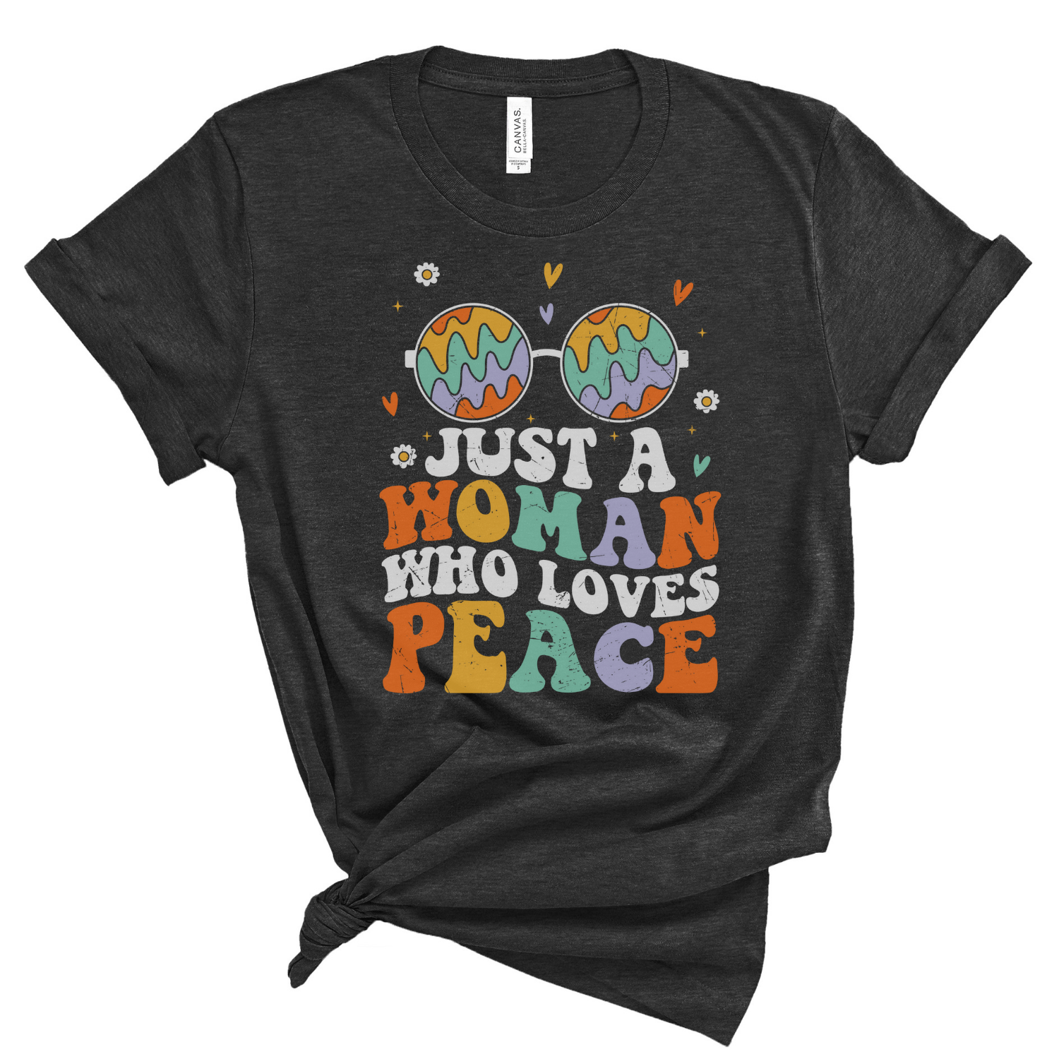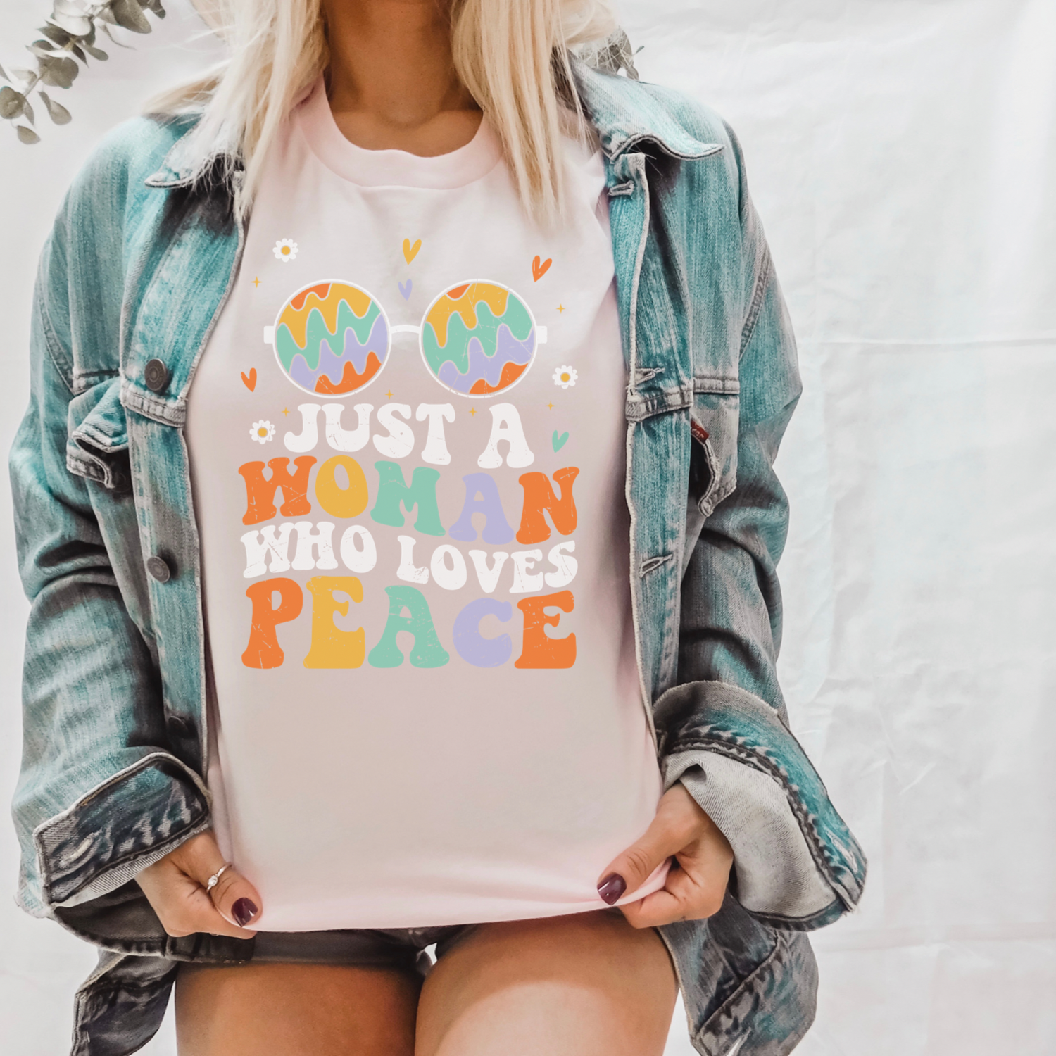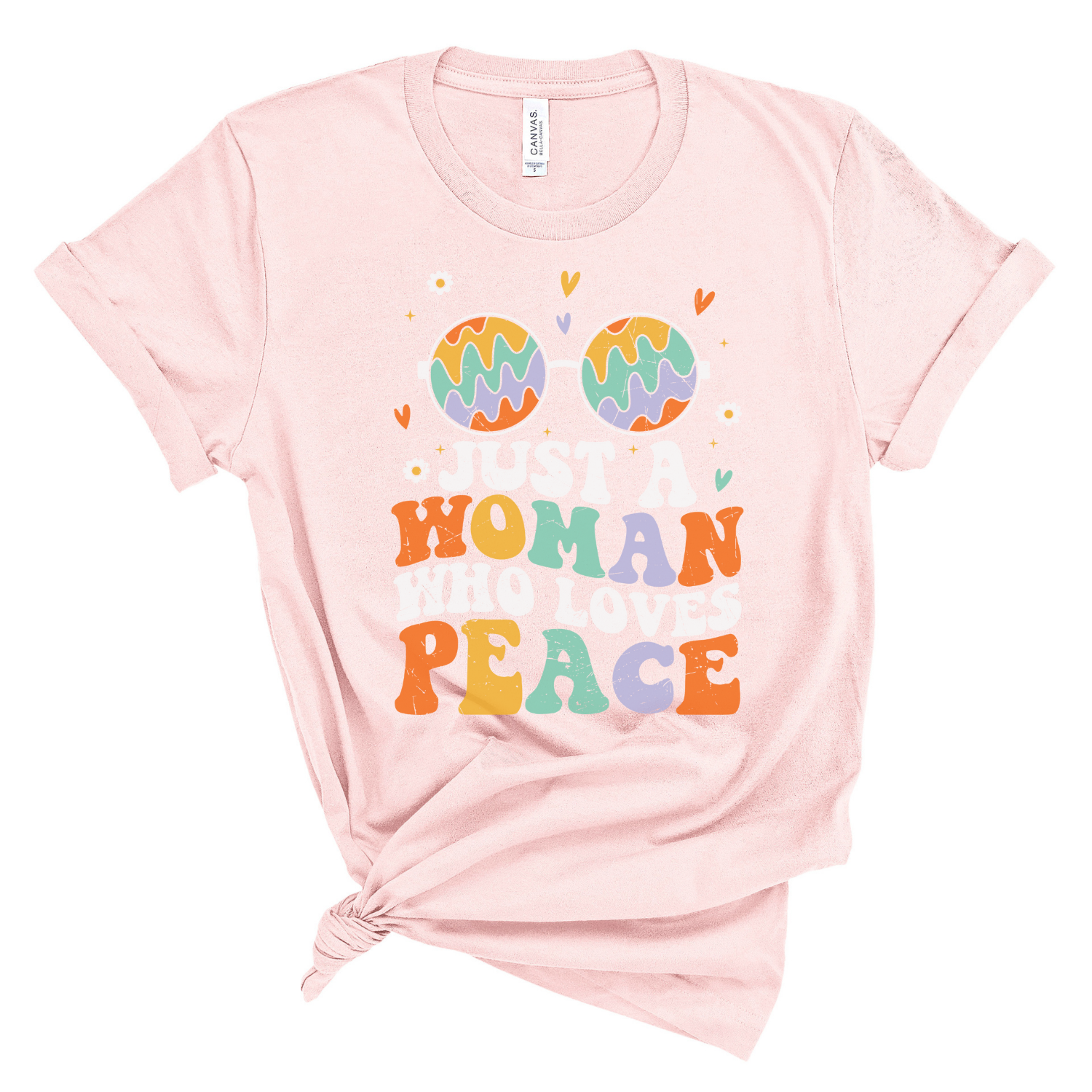 A soft, unisex graphic tee featuring the phrase 'Just a Woman Who Loves Peace' in stylish lettering, perfect for casual wear.