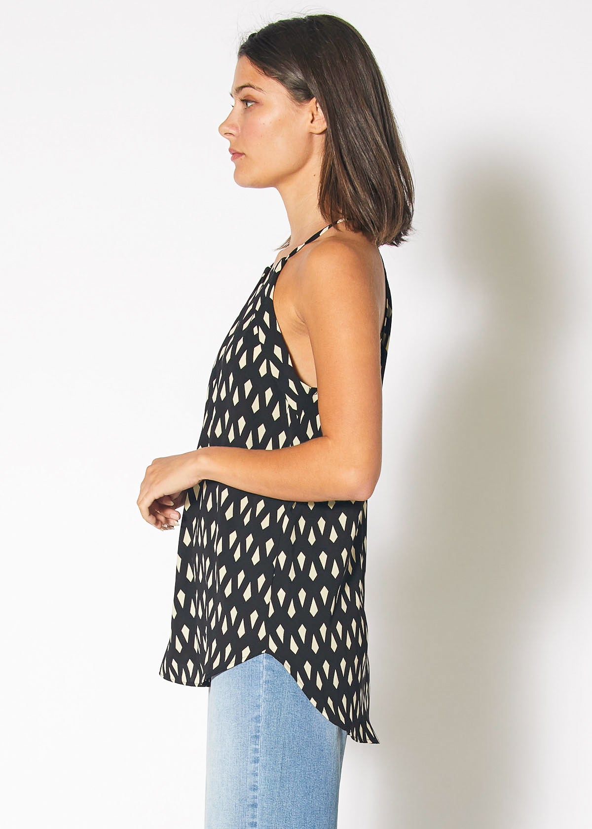 The black geo print adds a modern touch to this classic halter style. The geometric patterns are trendy and versatile, allowing you to pair this top with various bottoms, from jeans to skirts. Whether you're dressing up for a night out or keeping it casual for a day at the park, this top will elevate your look effortlessly.