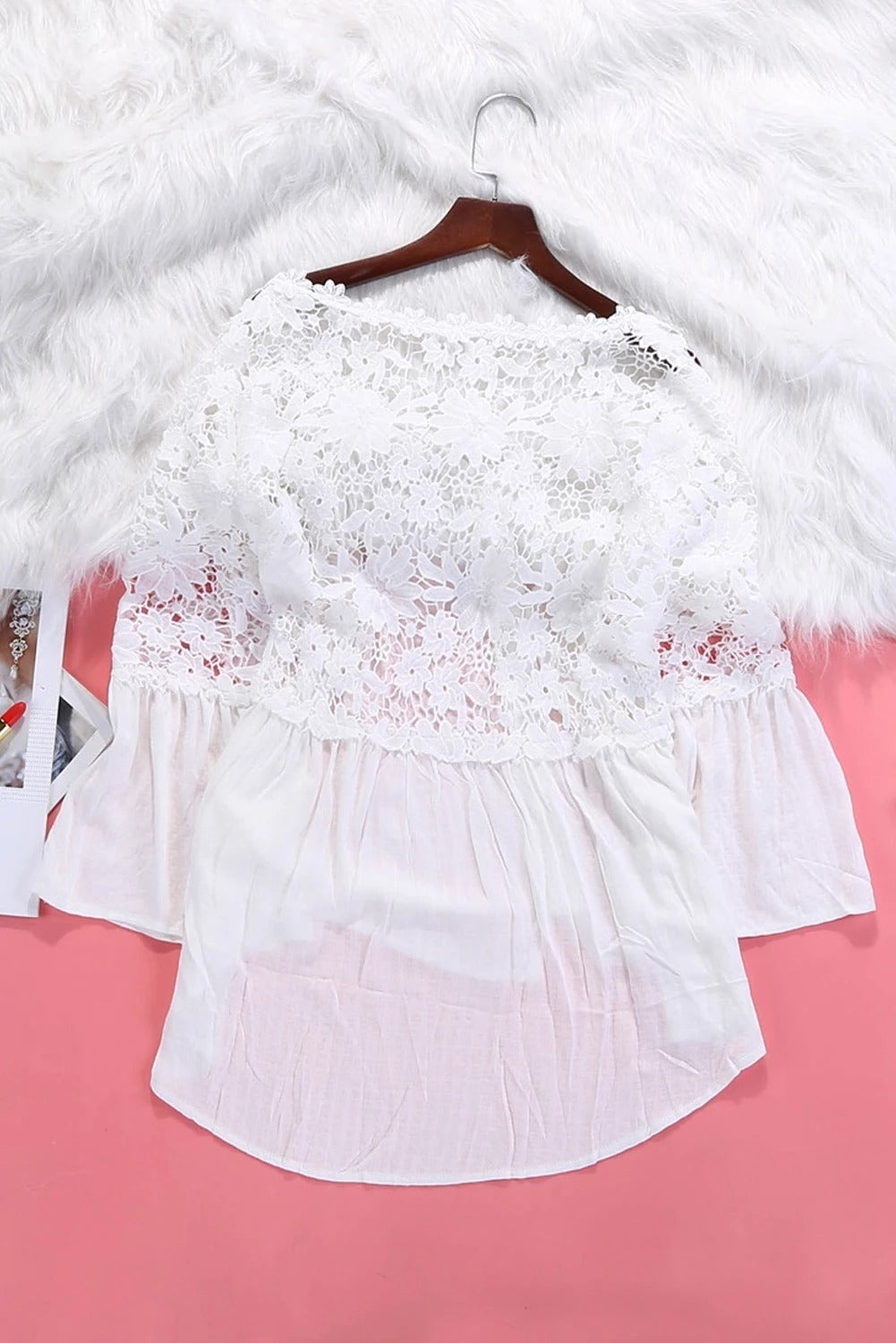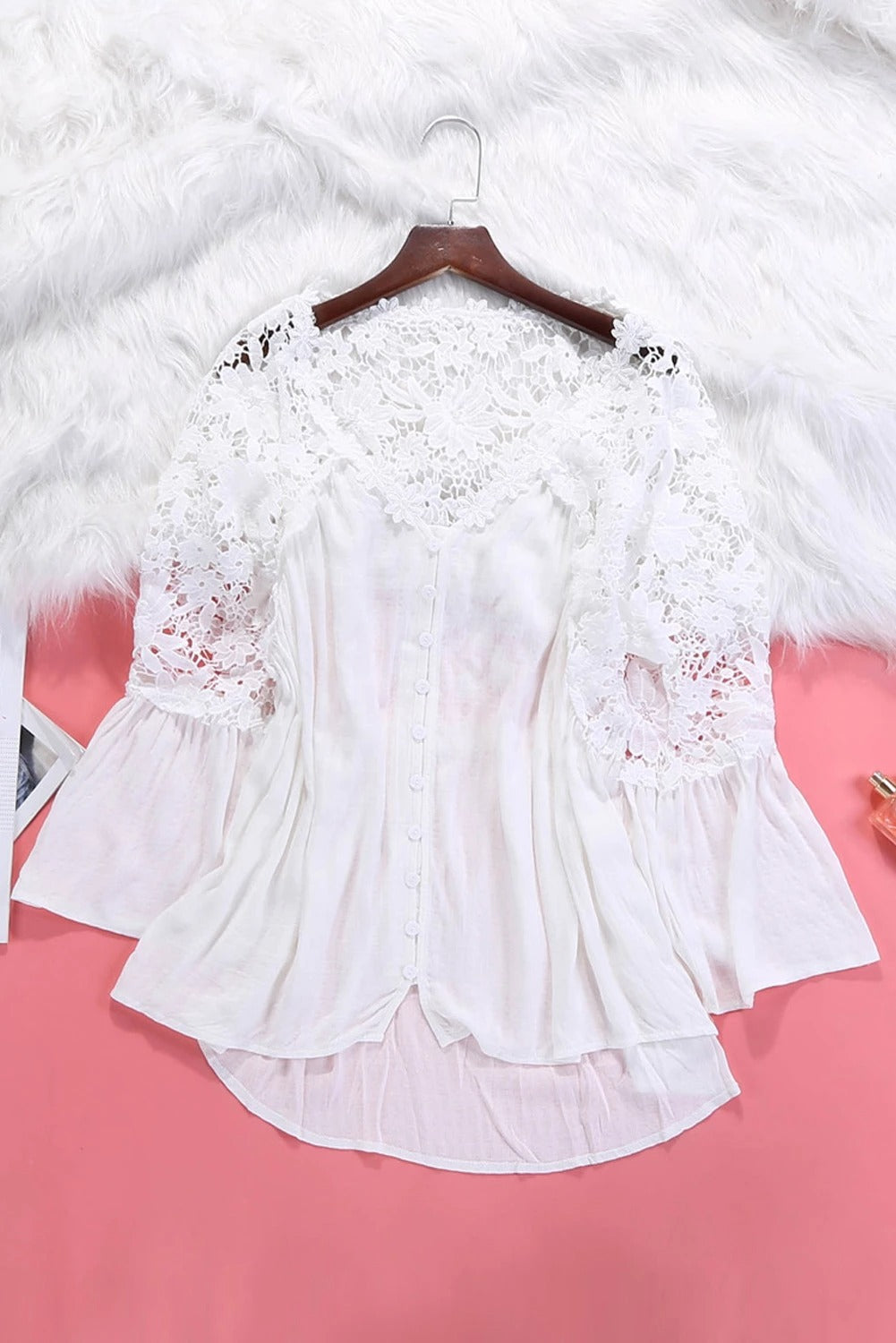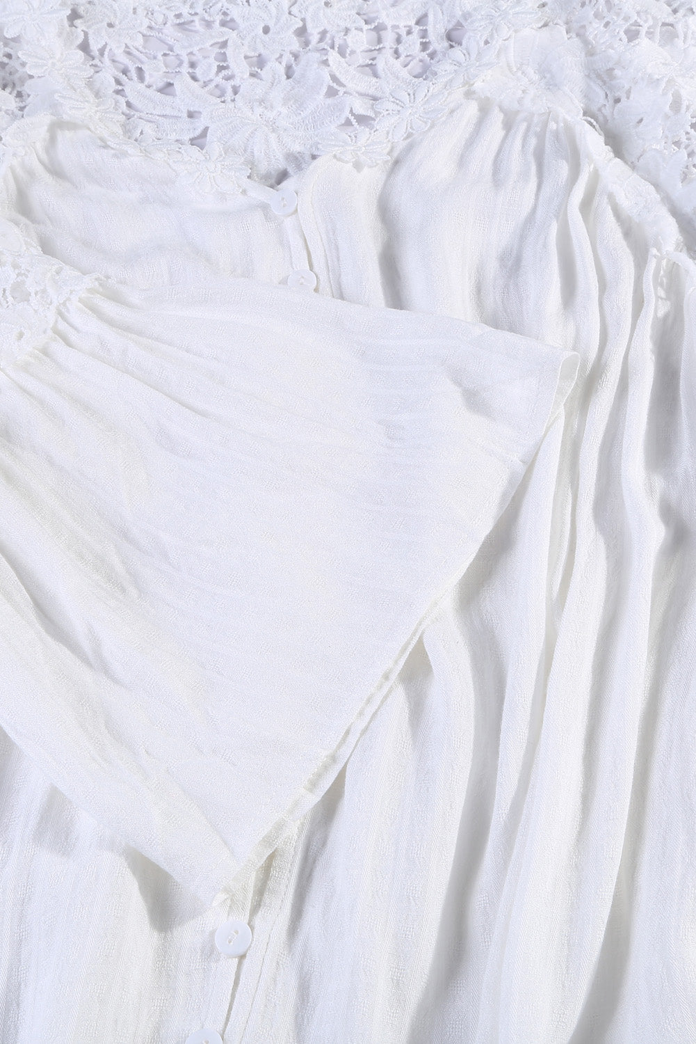A stylish white crochet lace top featuring a v-neckline, three-quarter bell sleeves, and button front detail, perfect for casual or formal occasions.