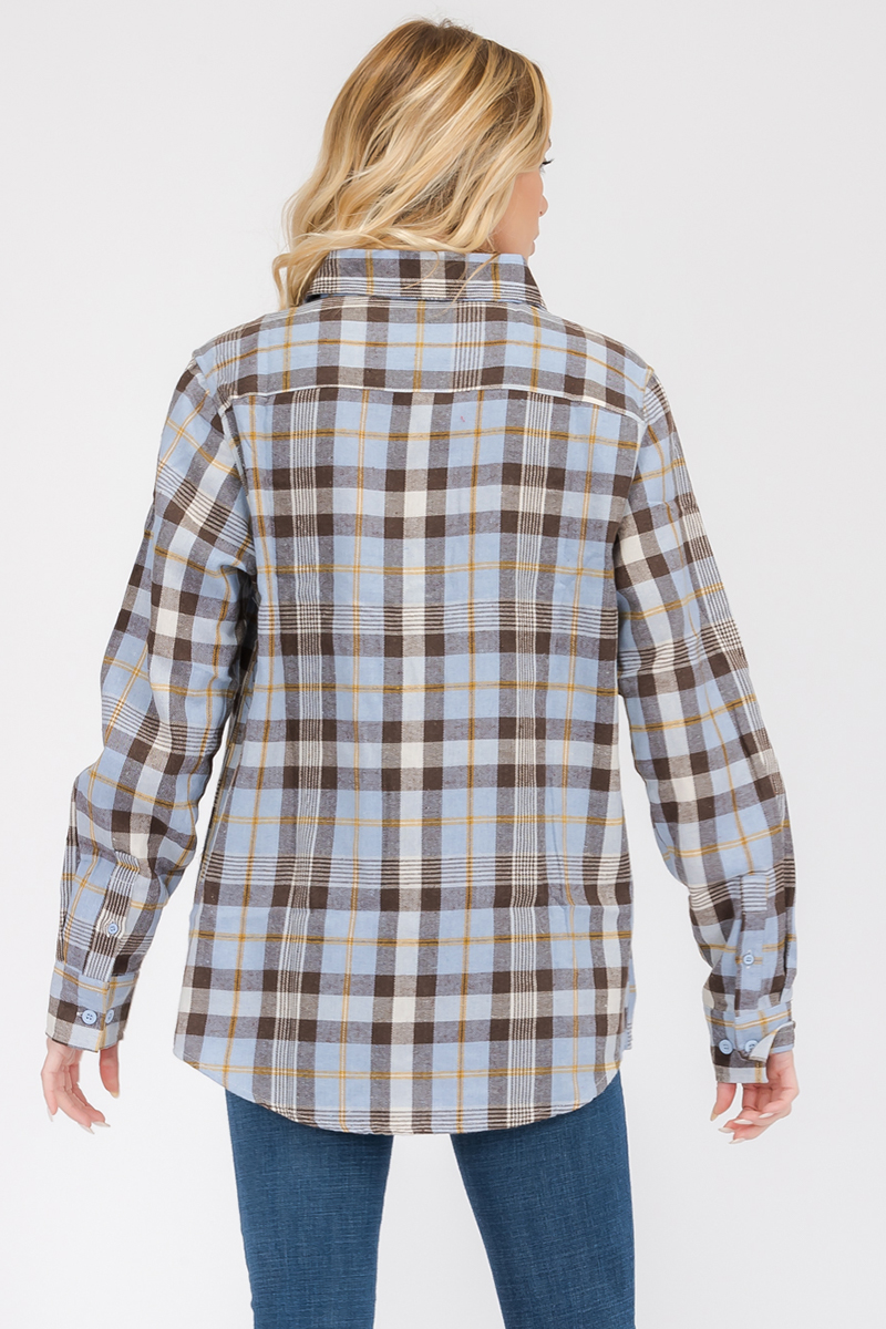 The all-over plaid checkered pattern adds a touch of classic charm to this flannel shirt. The timeless design ensures that you can wear it for various occasions, whether you're heading out for a casual day with friends or enjoying a cozy night in. The flat collar gives it a polished look, while the button-up front adds functionality and style.