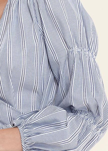 Smocked Sleeve Stripe Wrap Blouse in Blue featuring a deep V neckline and peasant sleeves, perfect for casual and chic outfits.