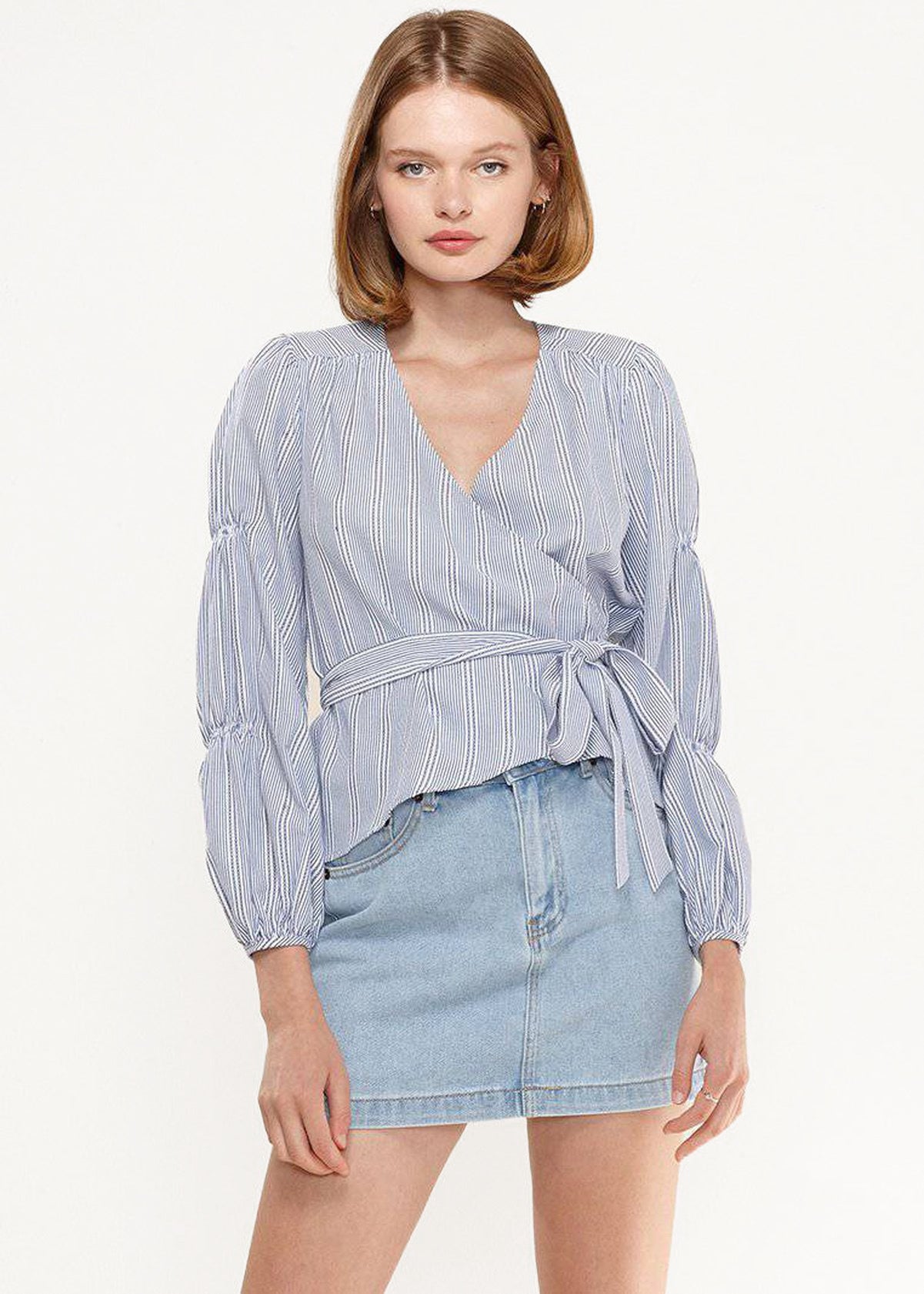 In summary, the Smocked Sleeve Stripe Wrap Blouse in Blue is a stylish and versatile addition to any wardrobe. Its flattering design, quality materials, and chic aesthetic make it a perfect choice for any fashion-forward individual.