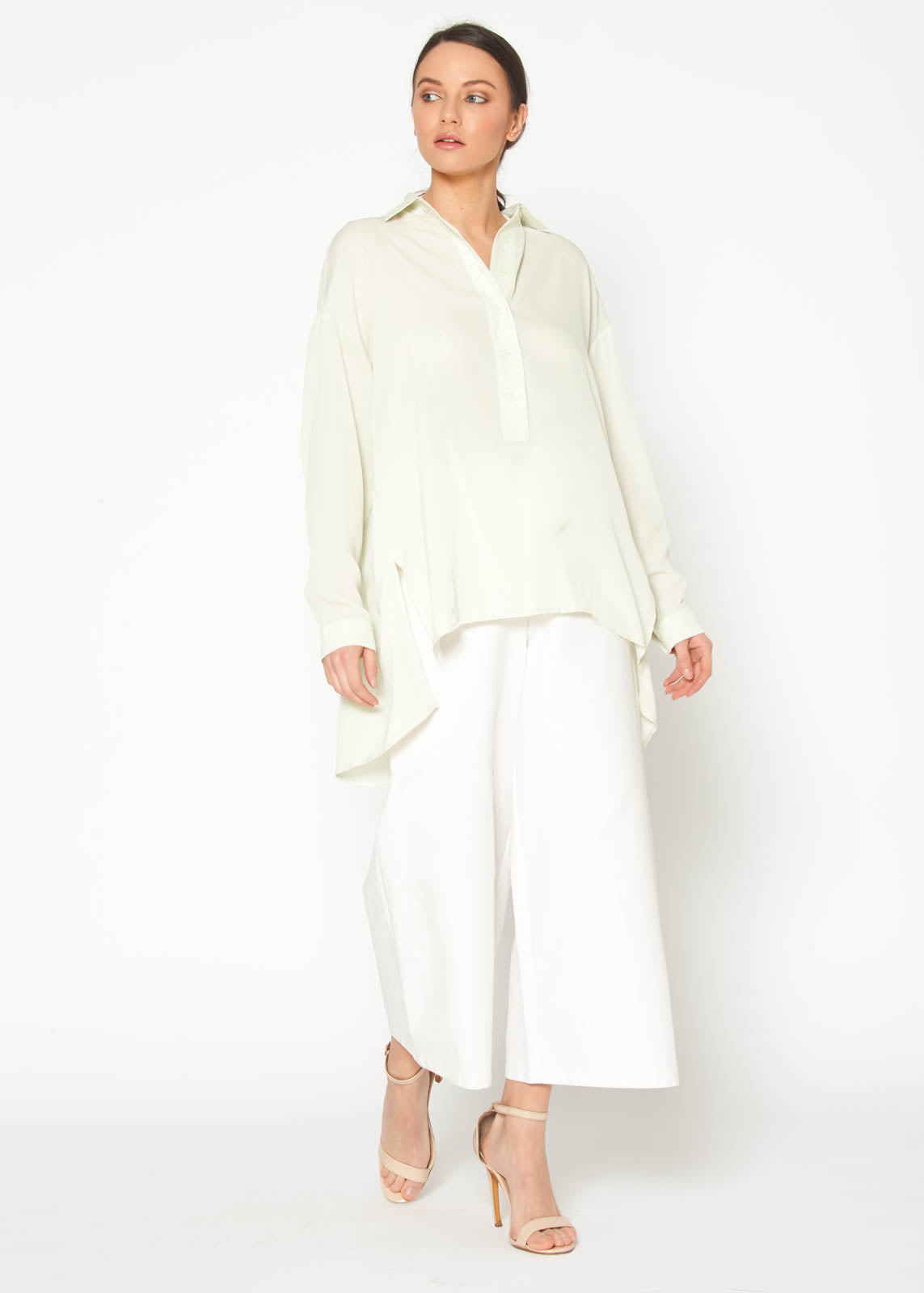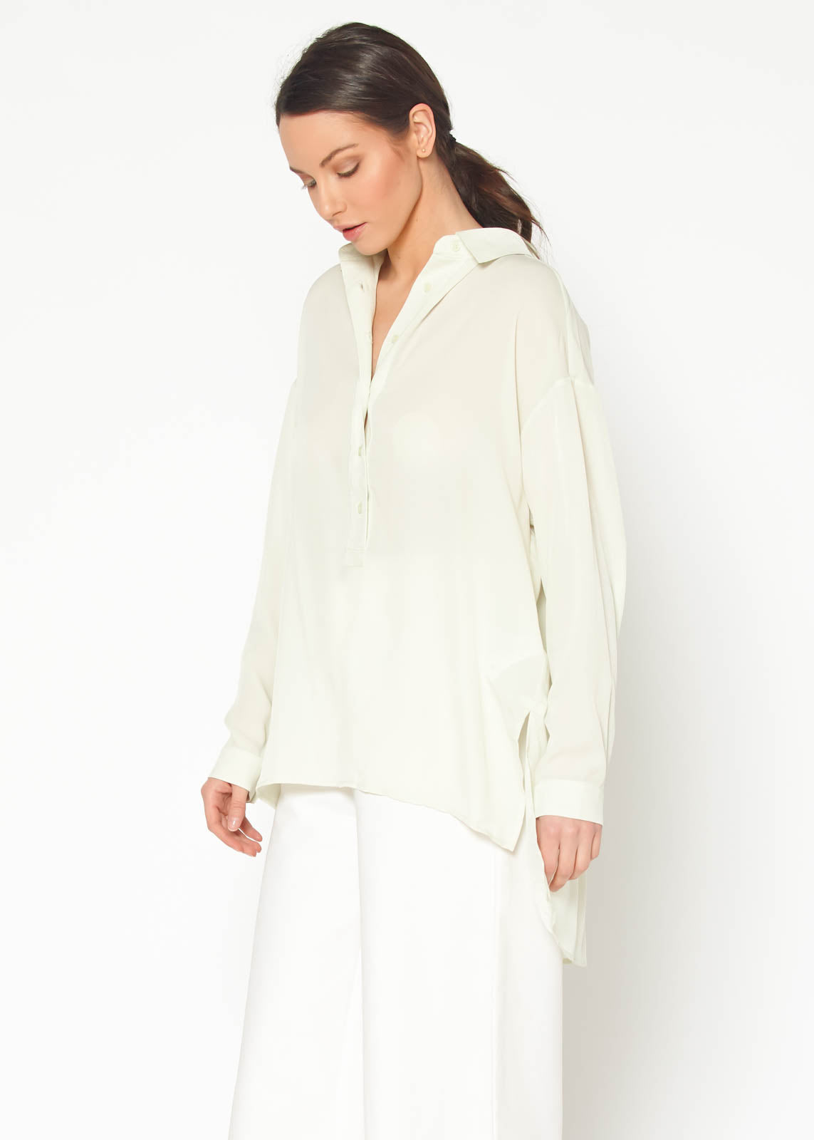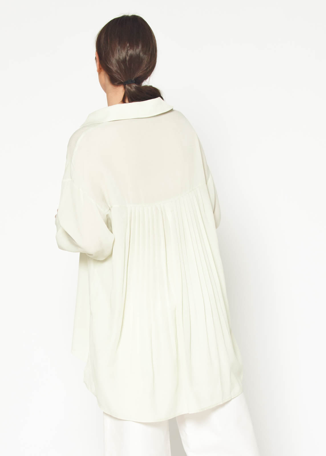 The standout feature of this blouse is its pleated back, which adds a unique touch and enhances the overall aesthetic. The pleats not only provide visual interest but also allow for ease of movement, making it a practical choice for everyday wear. The hi lo hemline creates a flattering shape that pairs beautifully with jeans, skirts, or tailored trousers.