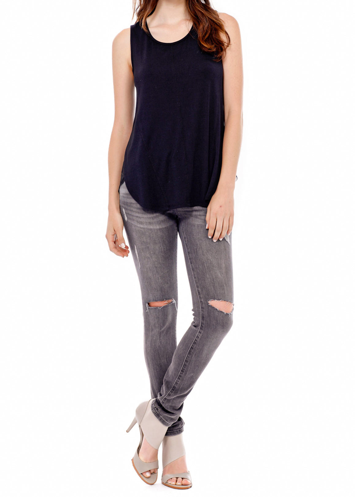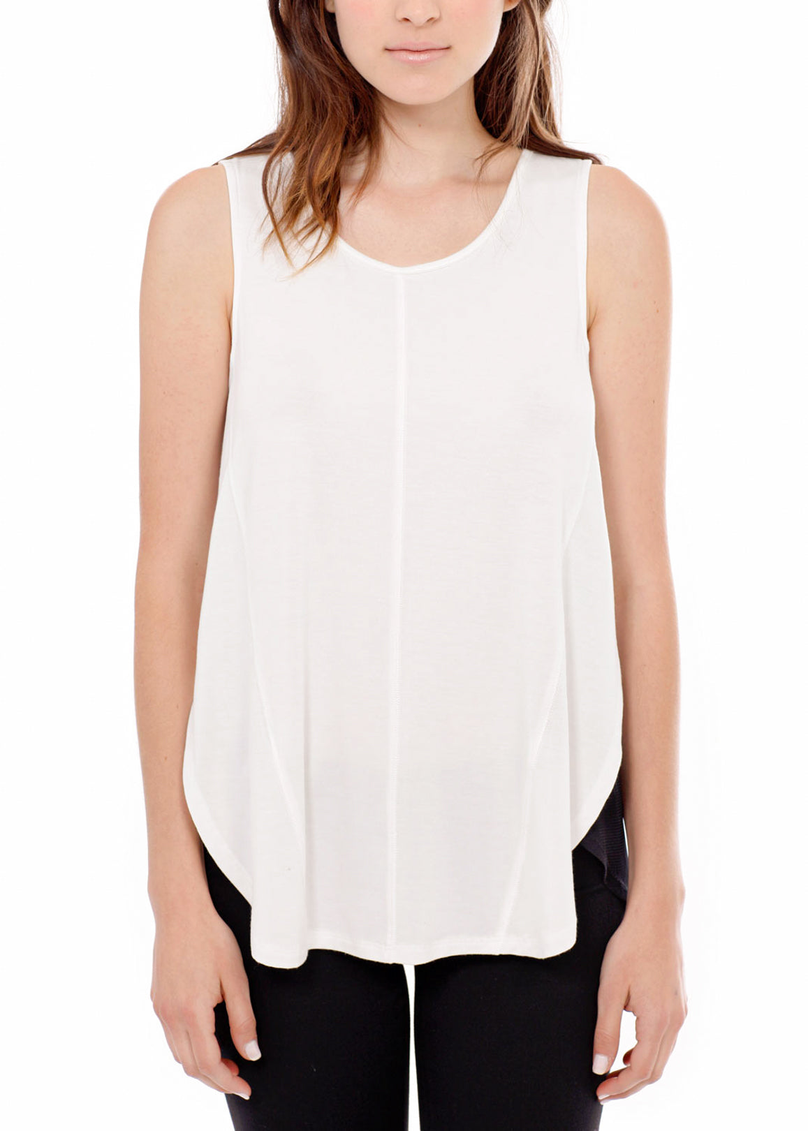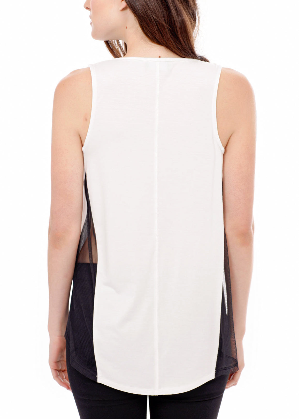 The Women's Sleeveless Tulle Contrast Tank Top stands out with its elegant and modern design. The sheer mesh side panels add a touch of sophistication, allowing for a glimpse of skin while maintaining a chic look. Whether paired with jeans, shorts, or a skirt, this tank top elevates any outfit effortlessly.