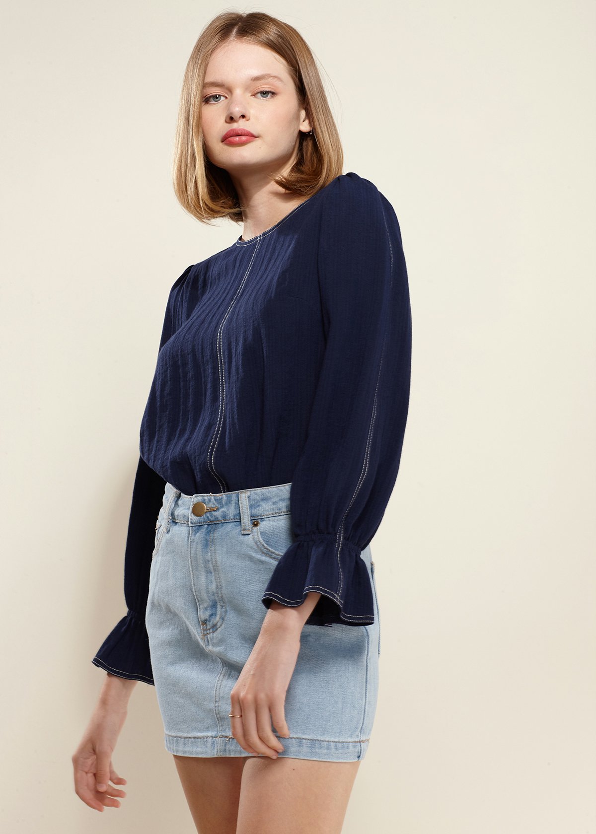 The standout feature of this top is its unique puff shoulder design, which adds a touch of elegance and sophistication. The bell cuffs further enhance the overall look, making it a fashionable choice for women who appreciate stylish details. The navy color is not only timeless but also easy to pair with various bottoms, ensuring you can create multiple outfits effortlessly.