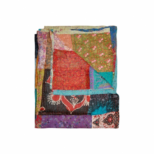 A vibrant 60x90 inches silk multicolor throw showcasing intricate patchwork and luxurious texture, handcrafted by Indian artisans.