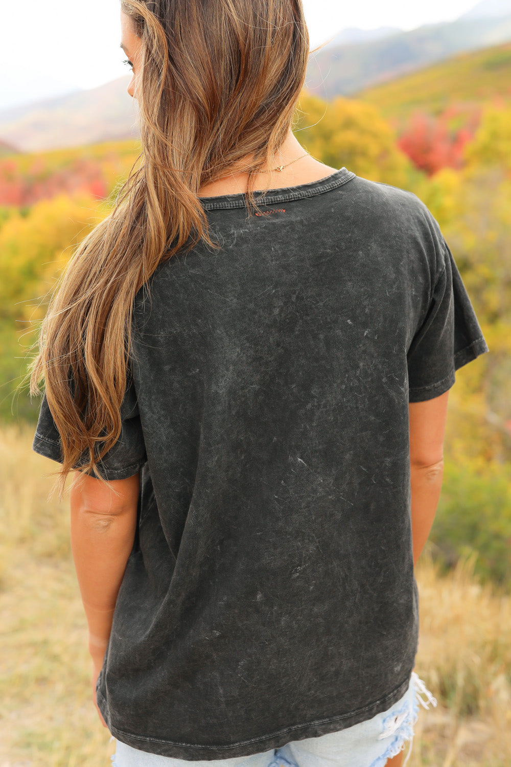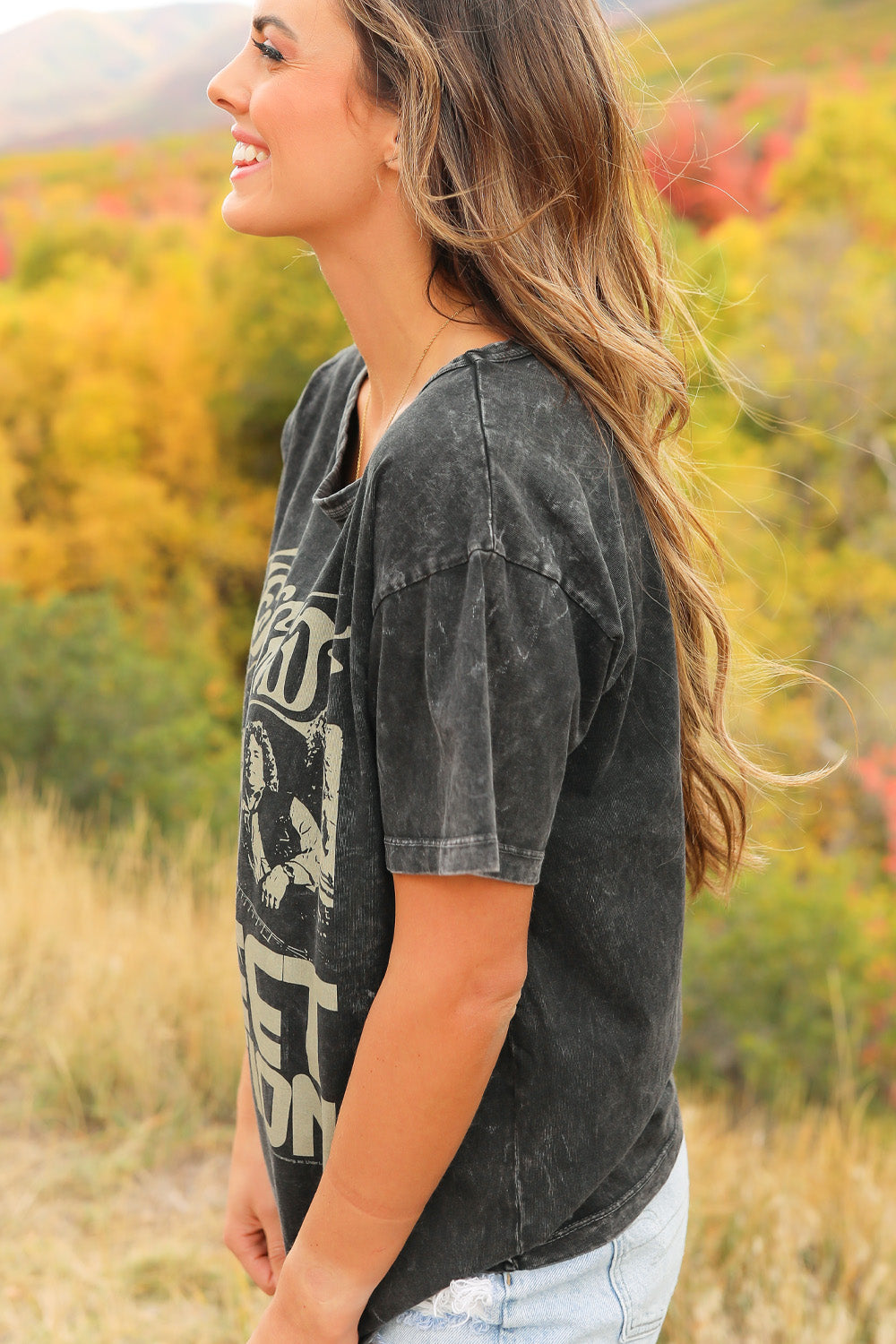 The shirt features a striking mineral wash black finish that gives it a vintage look, perfect for any rock music enthusiast. The unique wash process ensures that each shirt has its own distinct appearance, making it a one-of-a-kind addition to your wardrobe. The fabric is soft against the skin, making it ideal for all-day wear, whether you're at a concert, hanging out with friends, or just lounging at home.