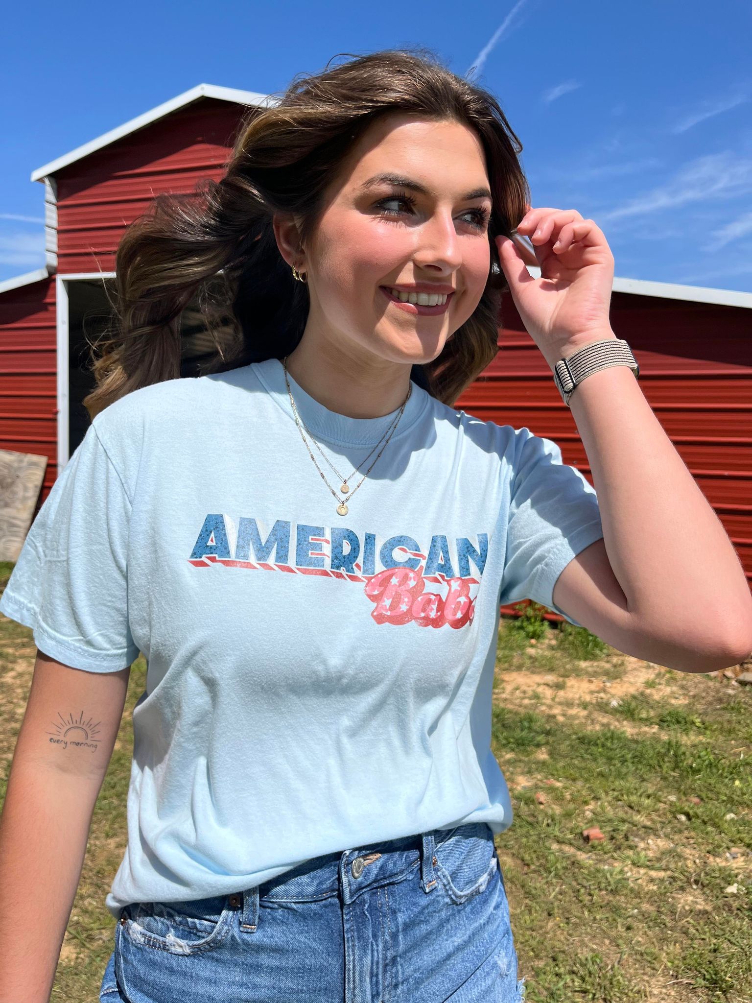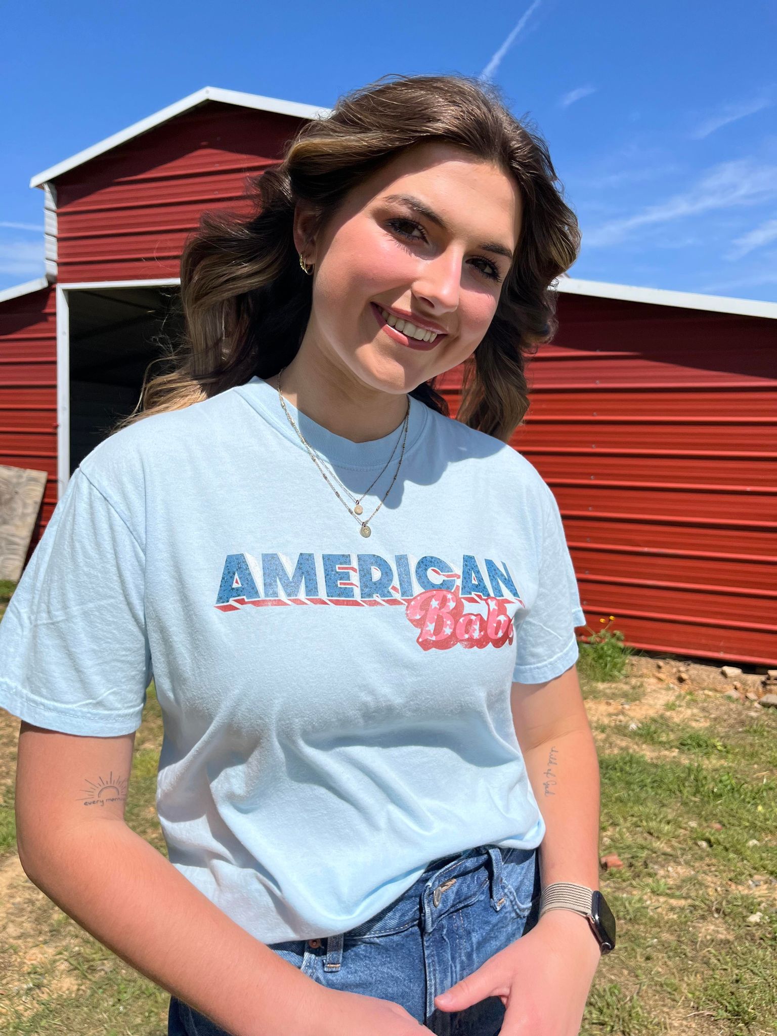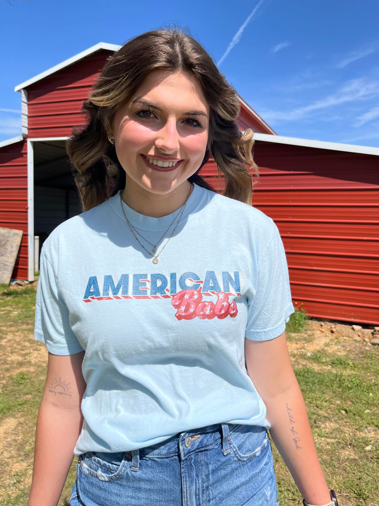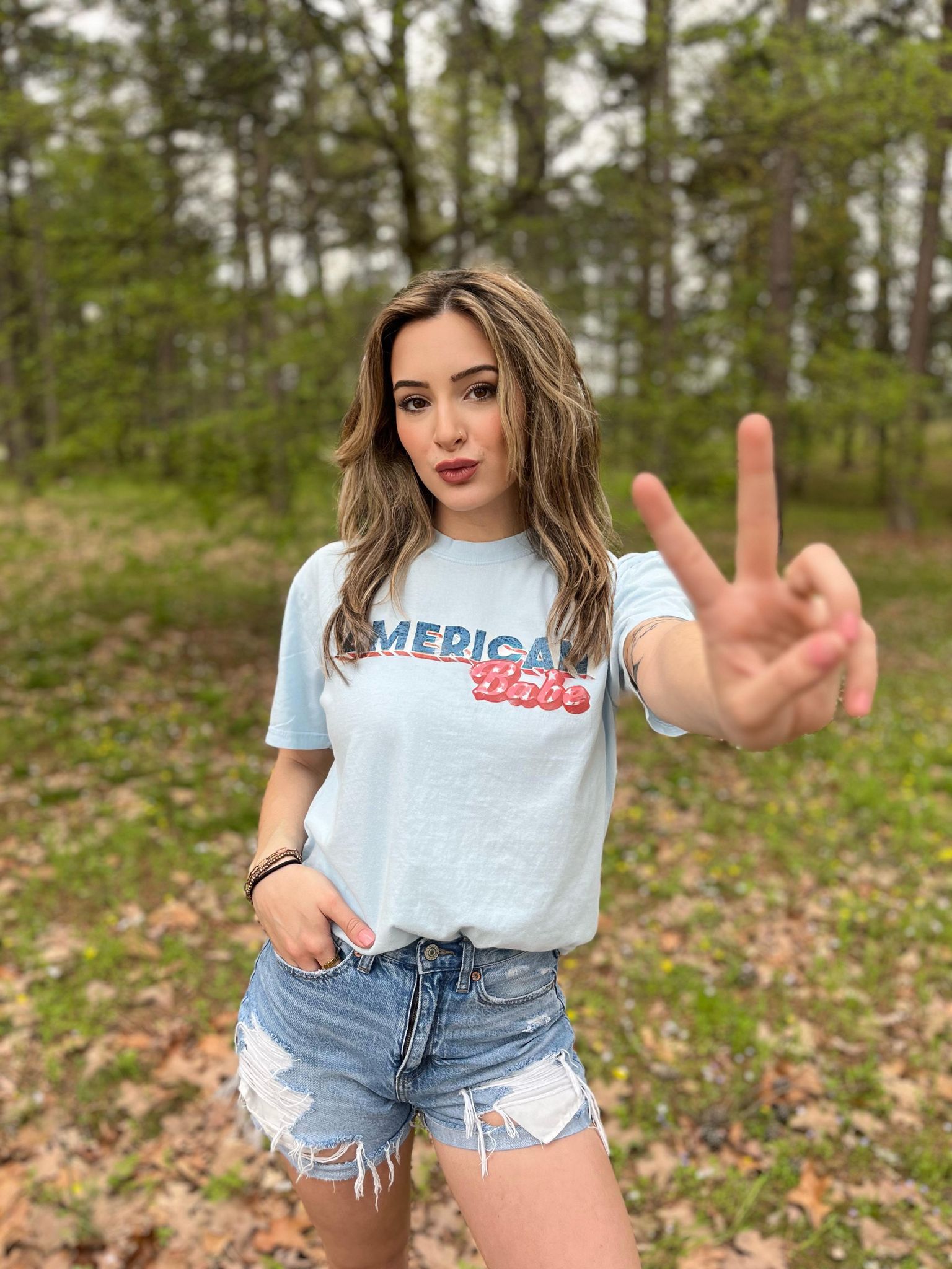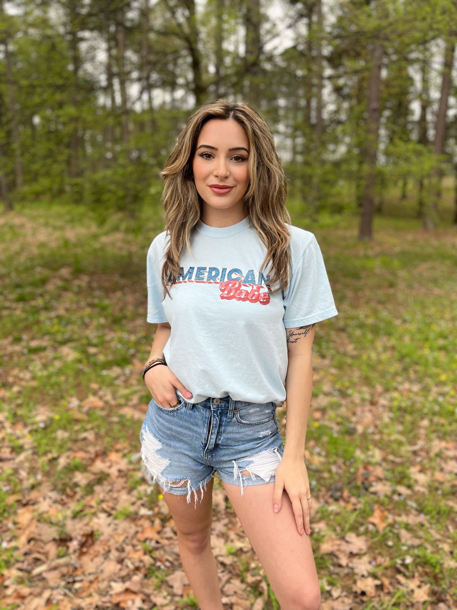 This tee features a charming design that proudly showcases your love for America. The vibrant Chambray color adds a trendy touch, making it easy to pair with your favorite shorts or jeans. Whether you're attending a barbecue, watching fireworks, or enjoying a picnic, the American Babe Tee will keep you looking stylish and feeling great.