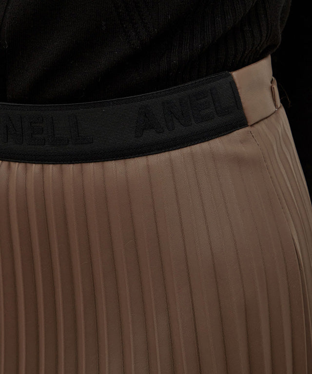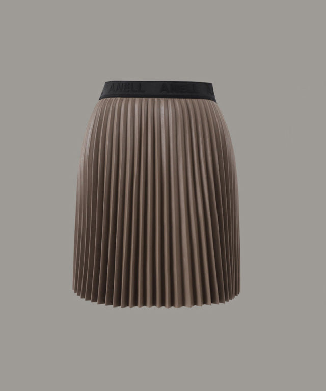 Anell Golf Bold Pleated Skirt in Brown, showcasing luxurious suede-combined leather with abundant pleats and a stylish design.
