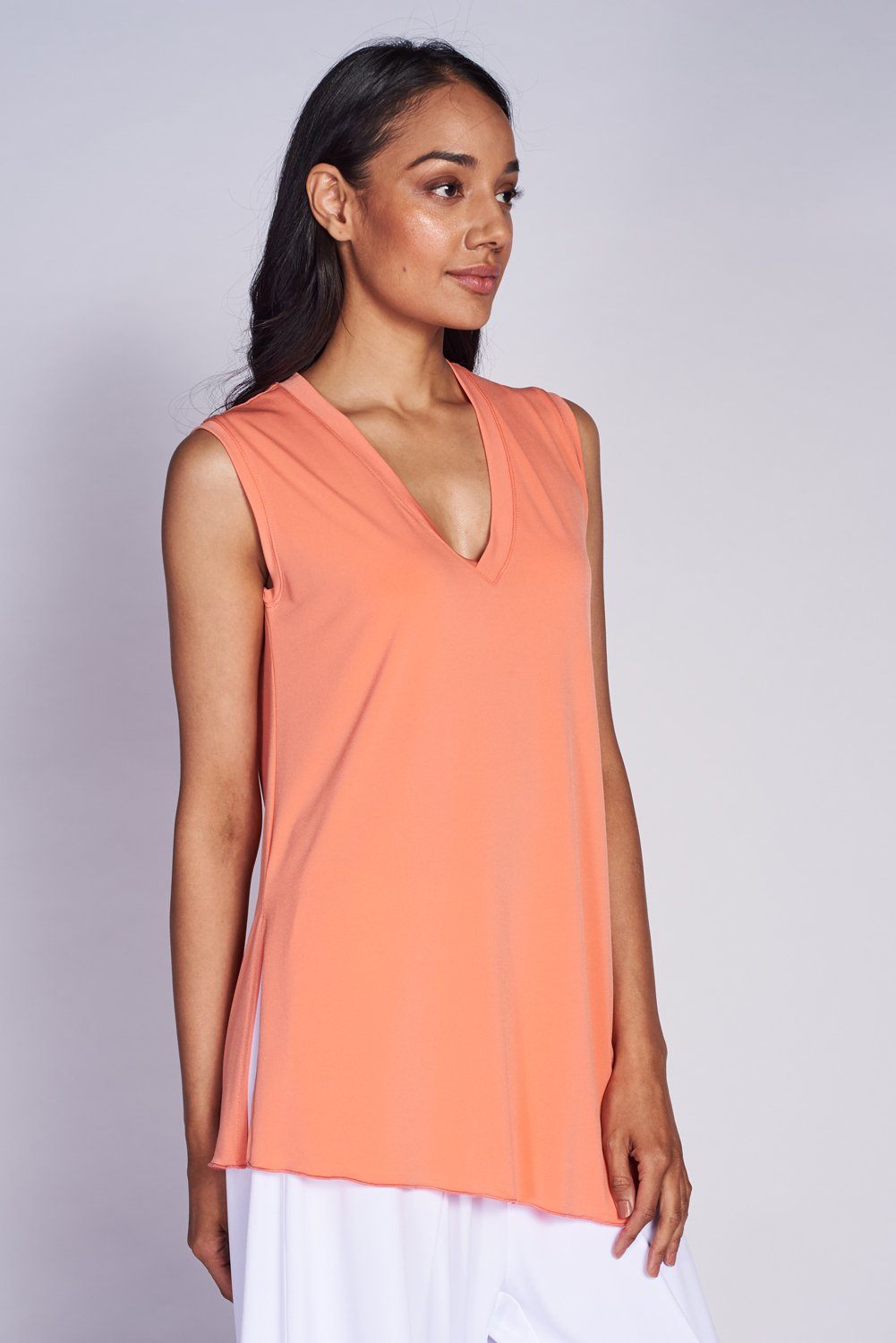 A stylish Angled Tank Top featuring wider shoulder straps and a side slit, made from soft lightweight fabric.