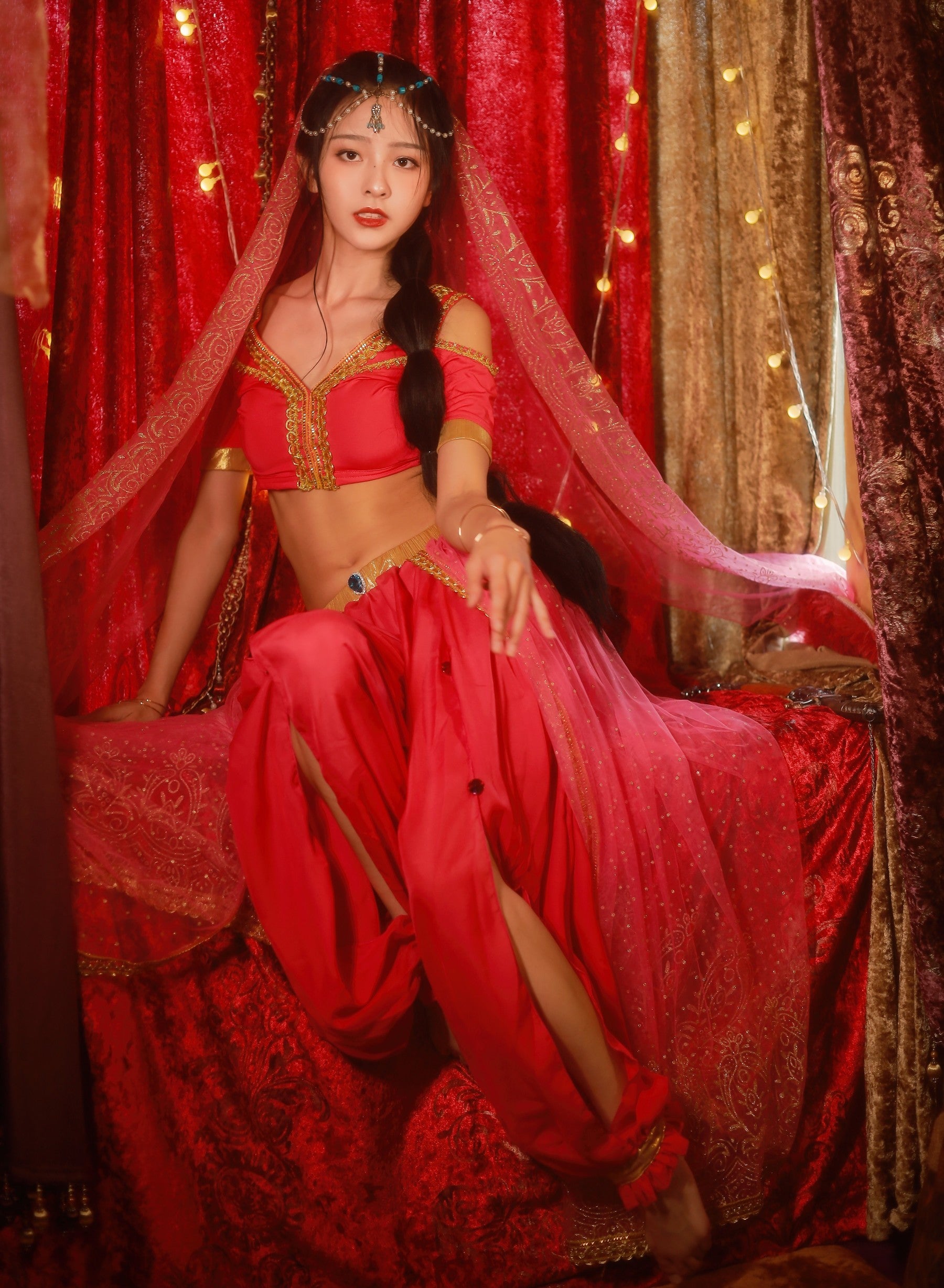 Step into the enchanting world of dance and celebration with our Arabian Princess Costumes Belly Dance Outfit. This exquisite ensemble is designed for those who wish to embody the elegance and allure of an Arabian princess. Perfect for various occasions such as belly dancing, Indian dance performances, Halloween parties, Bollywood events, and Sari dance, this outfit is sure to make you the center of attention.