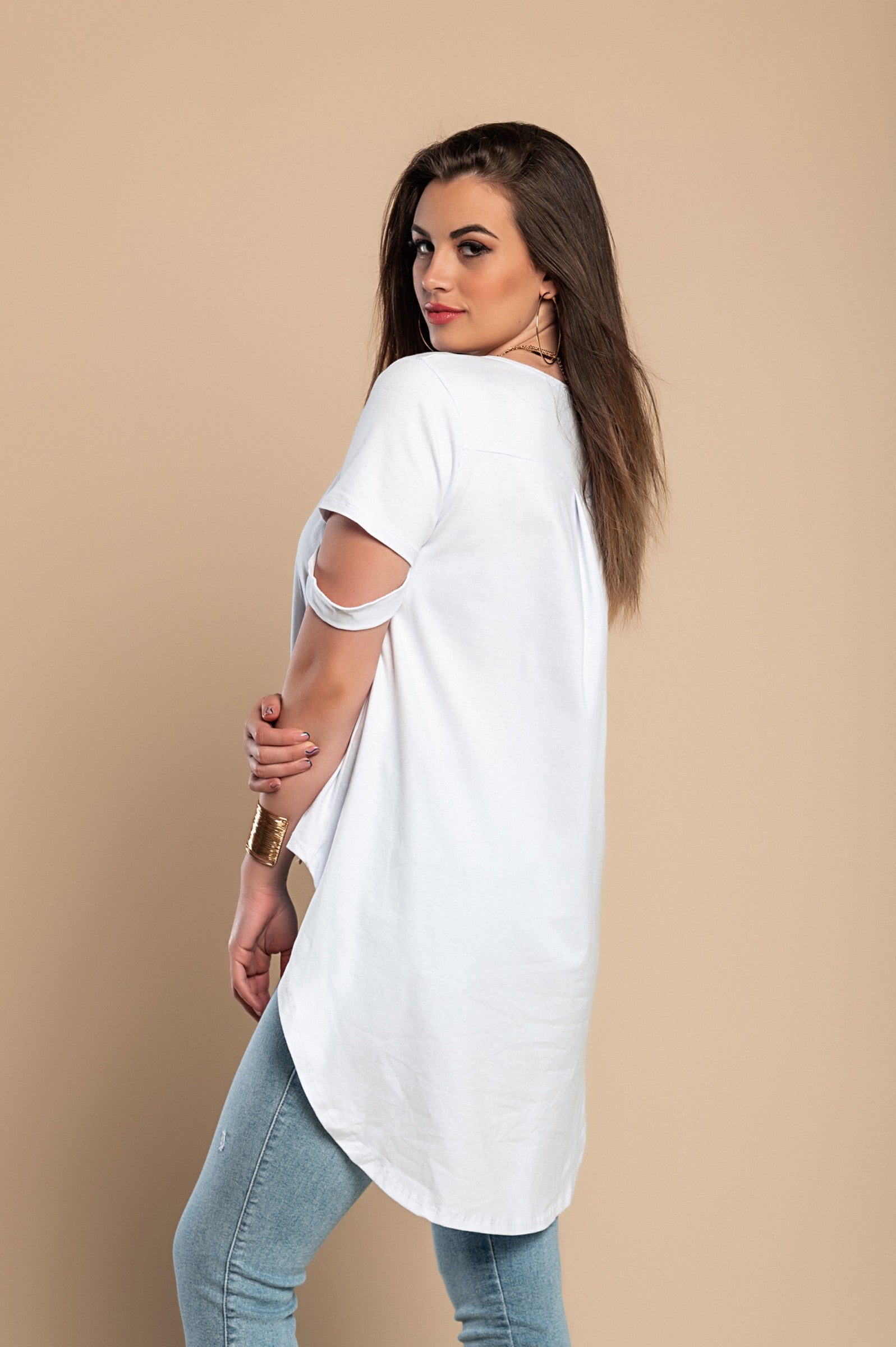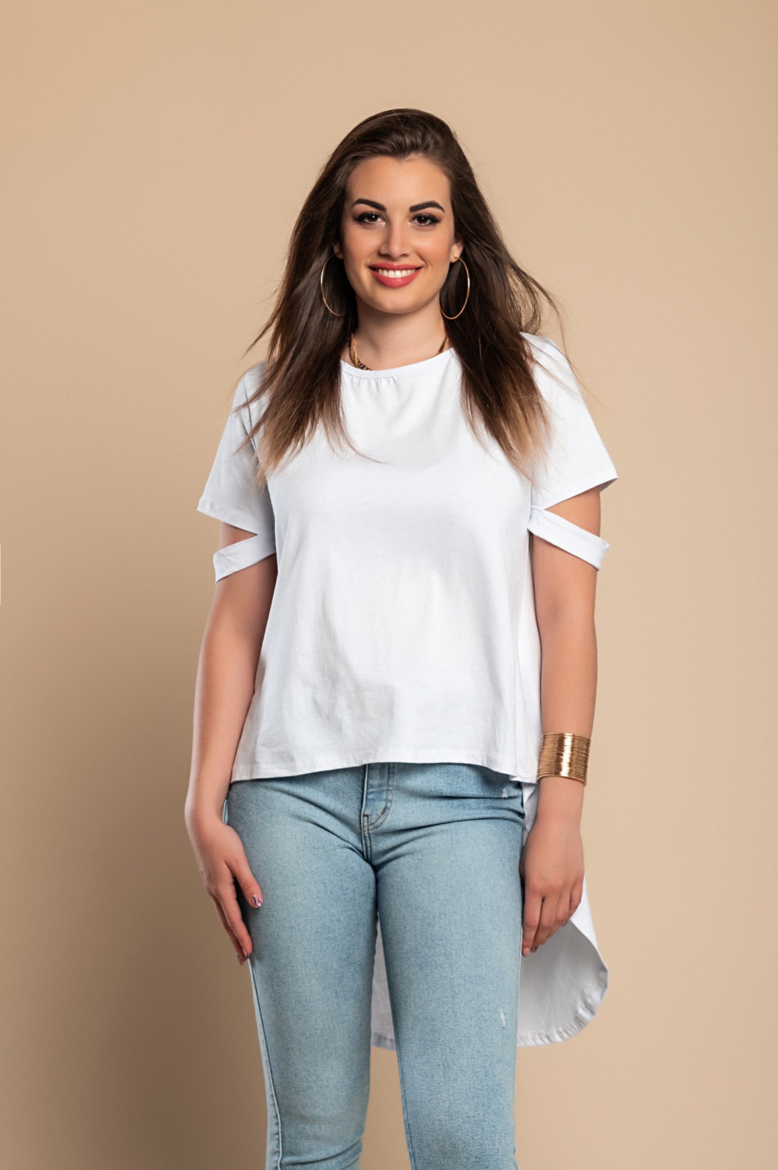 Odkrijte asimetrično kratko majico VEBTURA v beli barvi, ki združuje eleganco in udobje. Ta majica je zasnovana z mislijo na sodobne ženske, ki cenijo kakovost in stil. Izdelana je iz 95% visokokakovostnega bombaža in 5% elastana, kar zagotavlja mehkobo in elastičnost. Asimetrična dolžina, ki je na zadnji strani daljša, dodaja edinstven pridih in omogoča, da se majica odlično prilega različnim postavam.