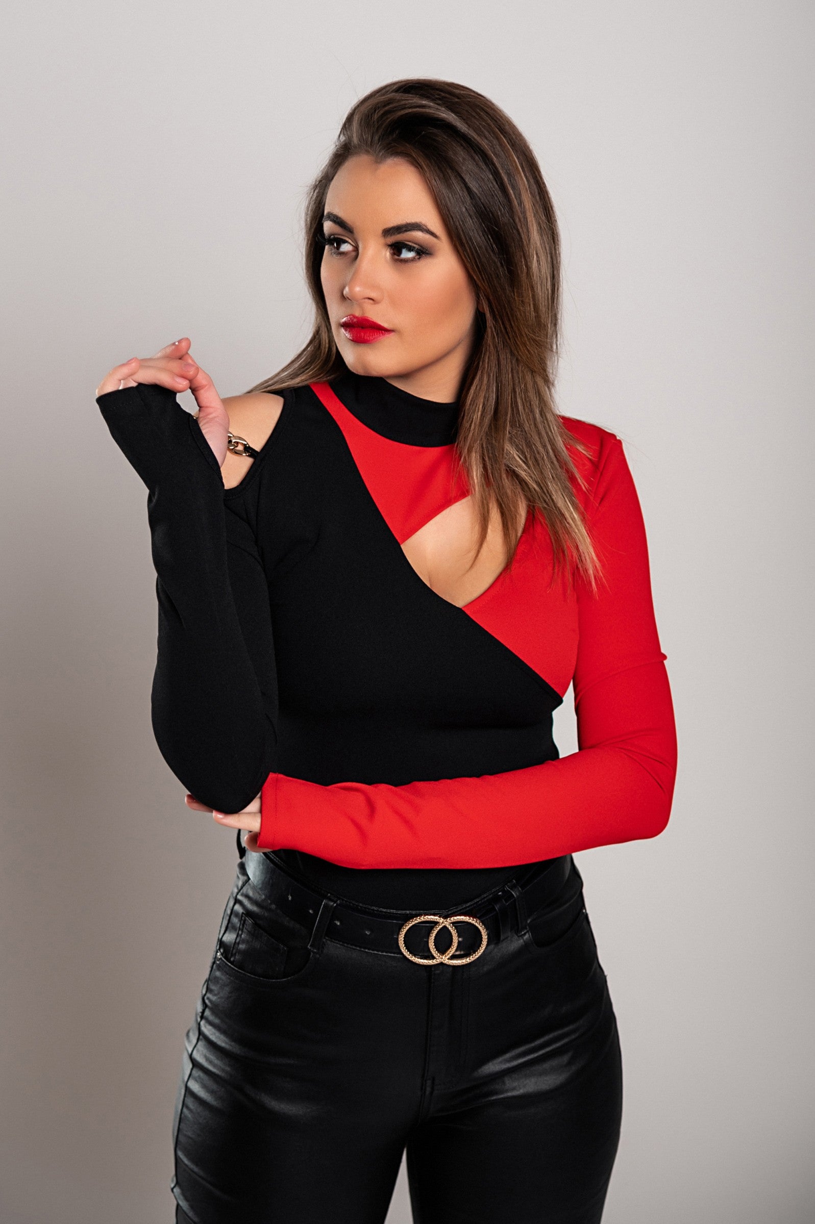 The Asymmetric Neckline Top Tahy in black and red is a stunning addition to any wardrobe. Crafted from high-quality, compact fabric, this top not only offers a chic look but also ensures perfect wearing comfort. The unique design features an asymmetrical plunging neckline that adds a touch of sophistication, making it suitable for both casual outings and more formal events.