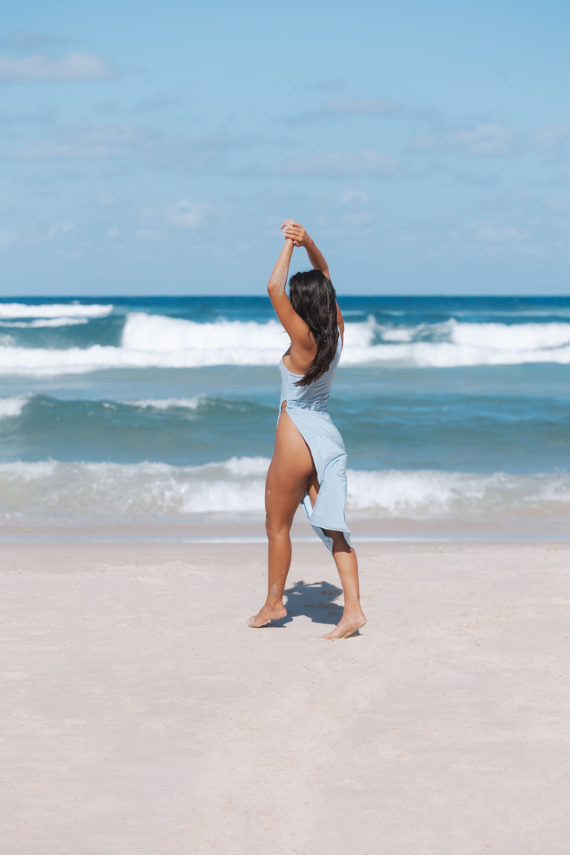 The versatility of the Bahama Dress makes it suitable for a variety of occasions. Pair it with heels for a sophisticated look at a wedding or dress it down with sandals for a casual brunch with friends. The baby blue shimmer adds a touch of elegance, making it a perfect choice for summer events, parties, or even a romantic date night.