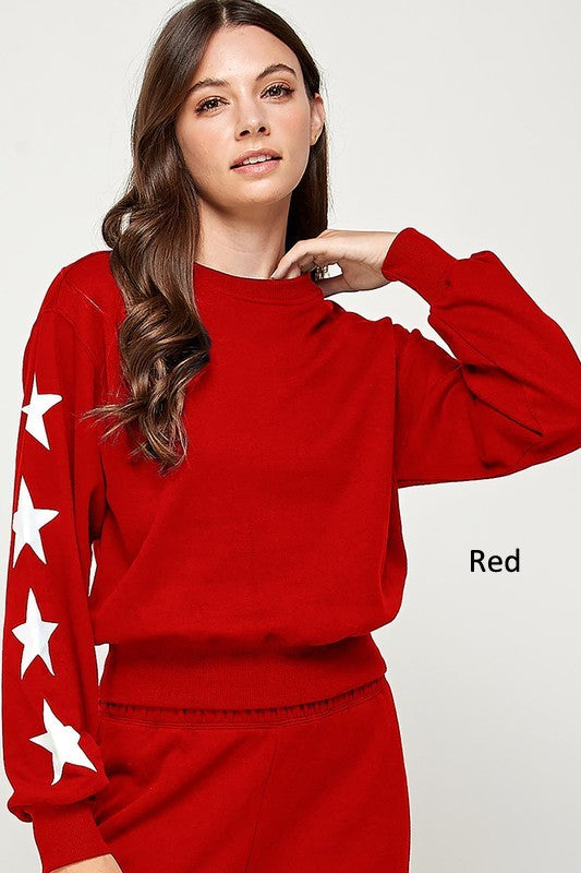 The Basic Fleece Sweatshirt with Star Print is the perfect blend of comfort and style, designed for those who love to express their personality through their wardrobe. This sweatshirt features a playful design with four large white stars running down the sides of each sleeve, making it a standout piece in any casual outfit. Whether you're lounging at home or heading out for a casual day with friends, this sweatshirt will keep you cozy and fashionable.