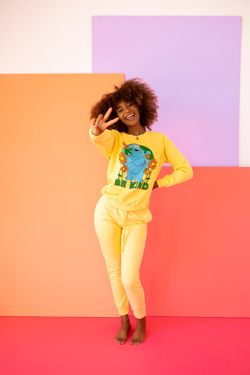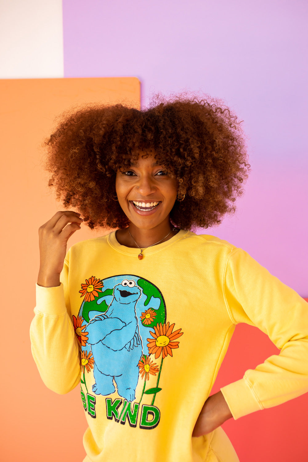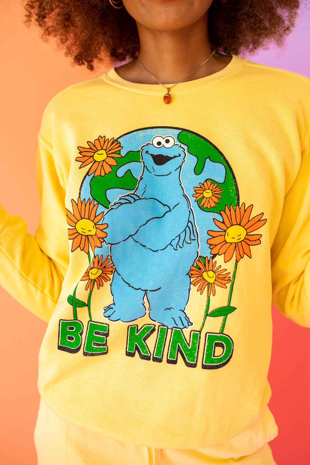 The Be Kind Cookie Monster Sweatshirt showcases a playful design that resonates with fans of all ages. The cheerful yellow color and the iconic Cookie Monster graphic create a fun and inviting look that is sure to turn heads. Whether you're running errands, lounging at home, or meeting friends for coffee, this sweatshirt adds a pop of color and personality to any outfit.