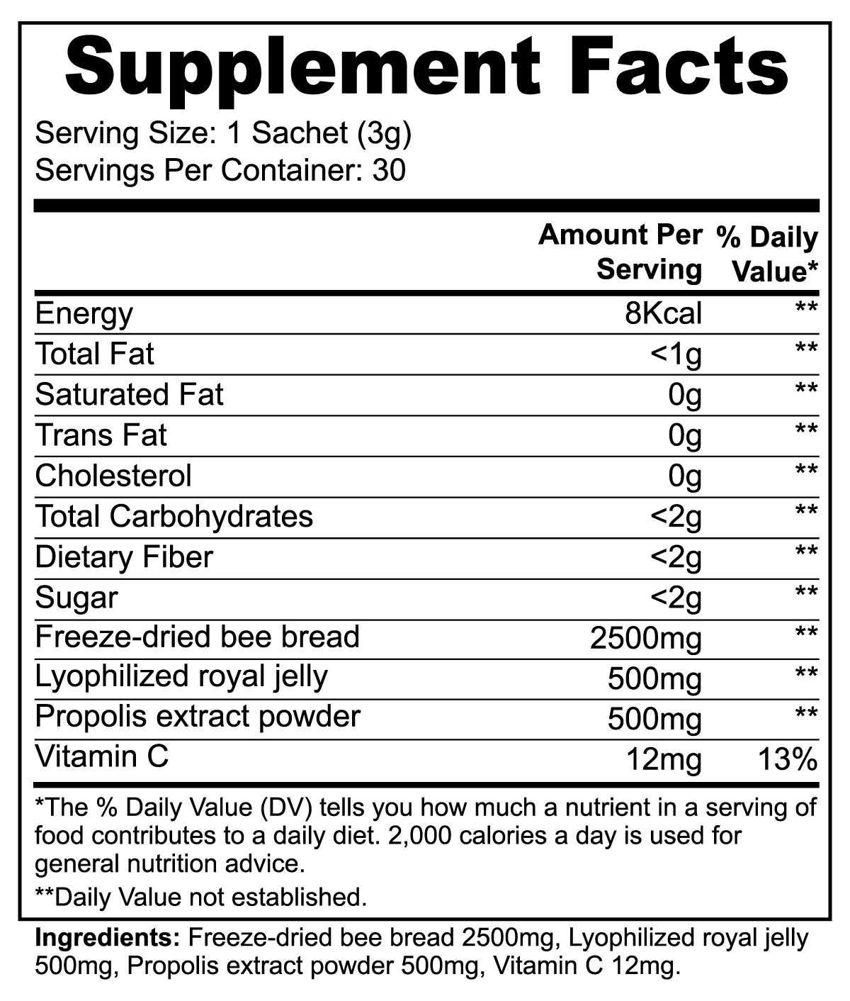 Discover the incredible benefits of Bee Pearl Powder, a premium add-in designed to enhance your smoothies and overall wellness. This unique blend combines concentrated bee bread, propolis, and royal jelly, offering a powerhouse of nutrients in every sachet. Each box contains 30 convenient sachets, making it easy to incorporate this natural bee product into your daily routine. Just mix one sachet into your favorite yogurt, smoothie, or cereal to enjoy a delicious and nutritious boost!