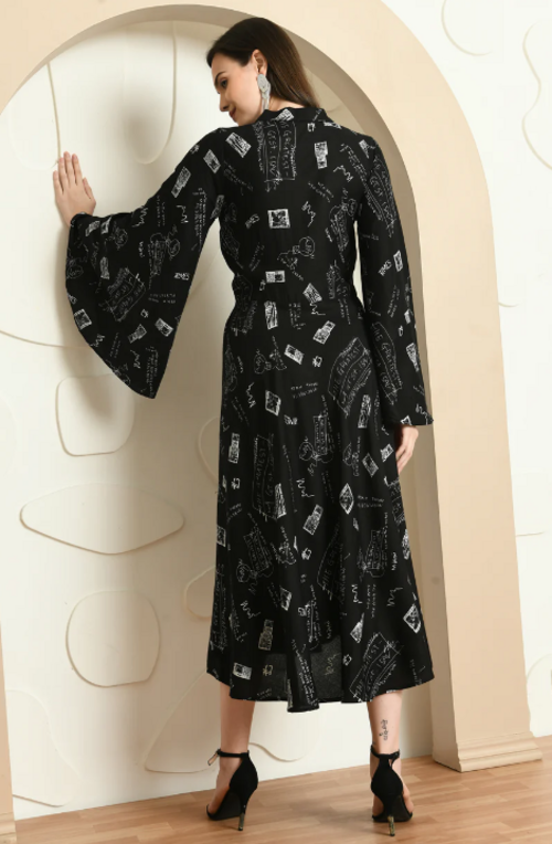 Make a fun statement with our Alphabet Umbrella Sleeves Dress. The unique umbrella sleeves and playful alphabet print add a touch of whimsy, while the flattering design ensures you stand out with effortless style.
