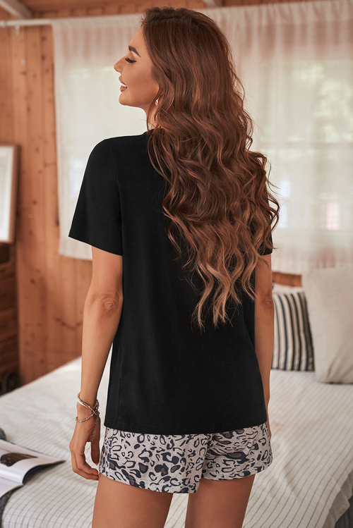 •Black stretchy knit self top and leopard print semi-stretchy knit self shorts