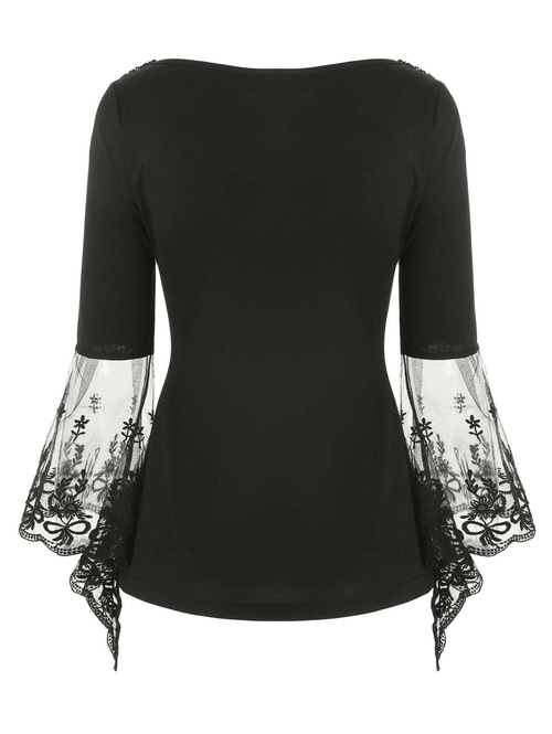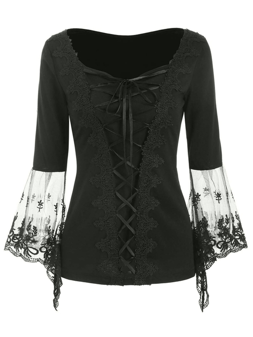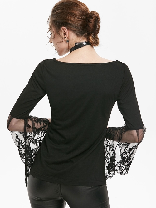 Material: Rayon Decoration: Lace Fabric Type: Broadcloth Style: Gothic Pattern Type: Solid Sleeve Length(cm): Full Sleeve Style: Flare Sleeve Model Number: Women T Shirt 20190730 Collar: O-Neck Clothing Length: REGULAR