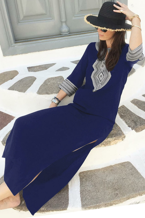 •Solid color maxi dress with ethnic embroidery