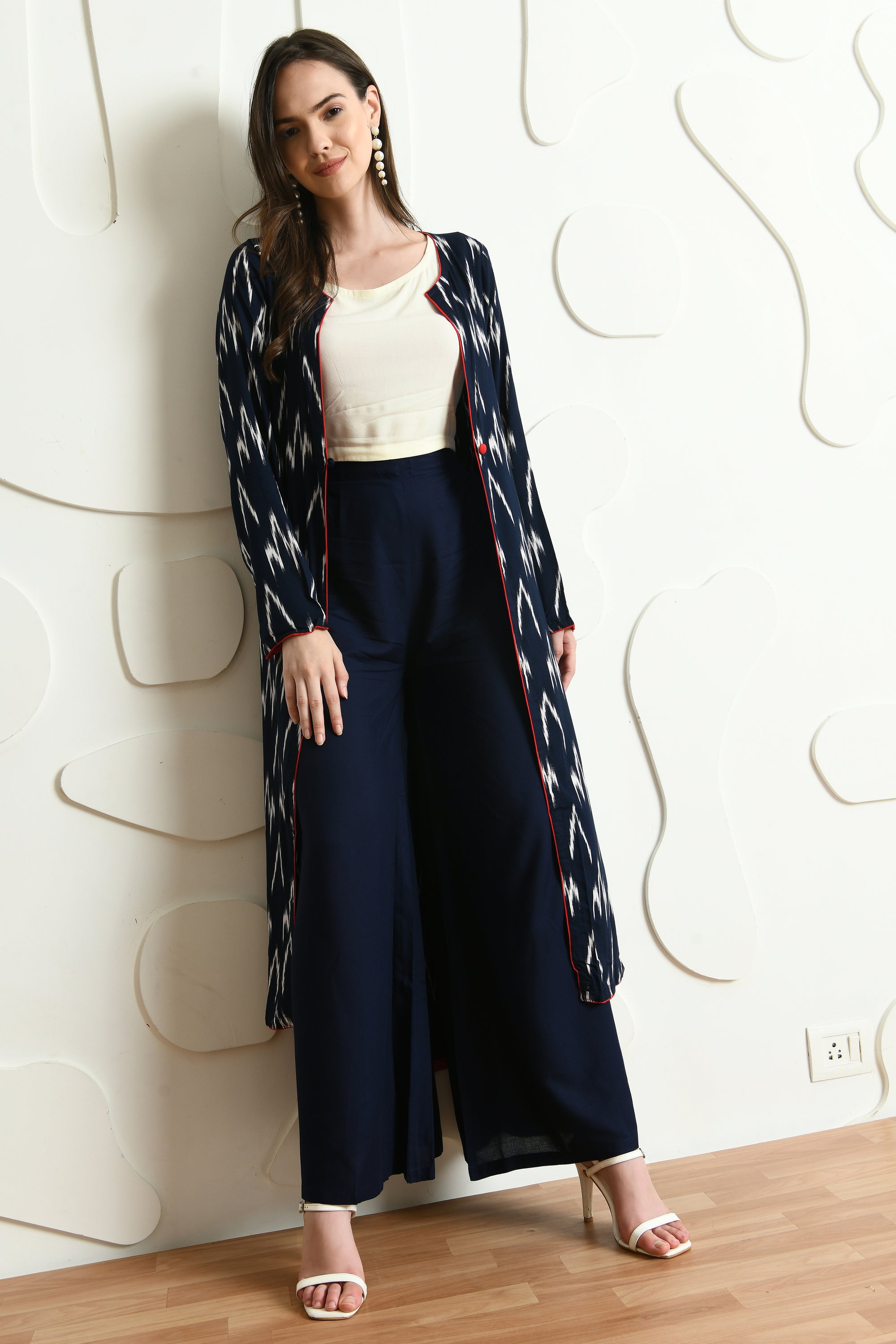 Introducing the Blue Ikhat Print Three PC set, a stunning ensemble designed for those who appreciate elegance and comfort. This outfit features a chic combination of a jacket, crop top, and palazzo, making it a versatile choice for various occasions. Whether you're attending a semi-formal event or a casual gathering, this outfit is sure to turn heads.