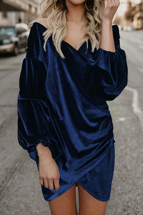 Dropship Blue Puff Sleeve Off Shoulder Wrap Bodycon Velvet Dress