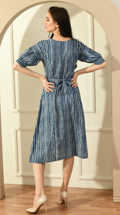 Blue STRIPE PUFF SLEEVES DRESS (Size S)
