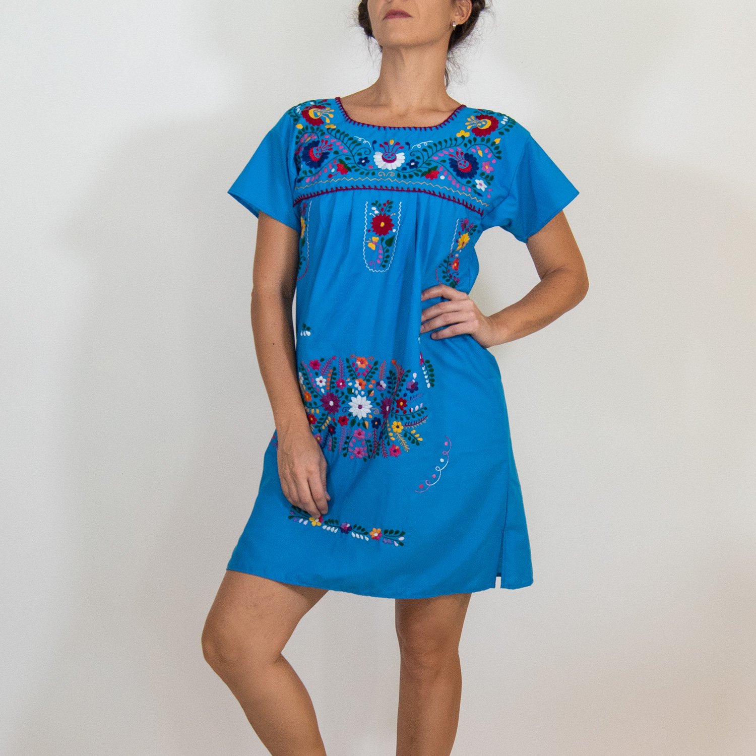 Introducing the stunning Blue Vintage Dress with Hand Embroidered Flowers, a perfect blend of comfort and style. This handmade Mexican dress is designed for versatility, allowing you to wear it as a summer dress with sandals or as a casual winter outfit paired with leggings or jeans. You can elevate your look by adding heels for a more formal occasion, or layer it with leather or denim jackets, blazers, or cardigans for a chic ensemble. Accessorize with scarves and hats to achieve a bohemian vibe that is both trendy and timeless.