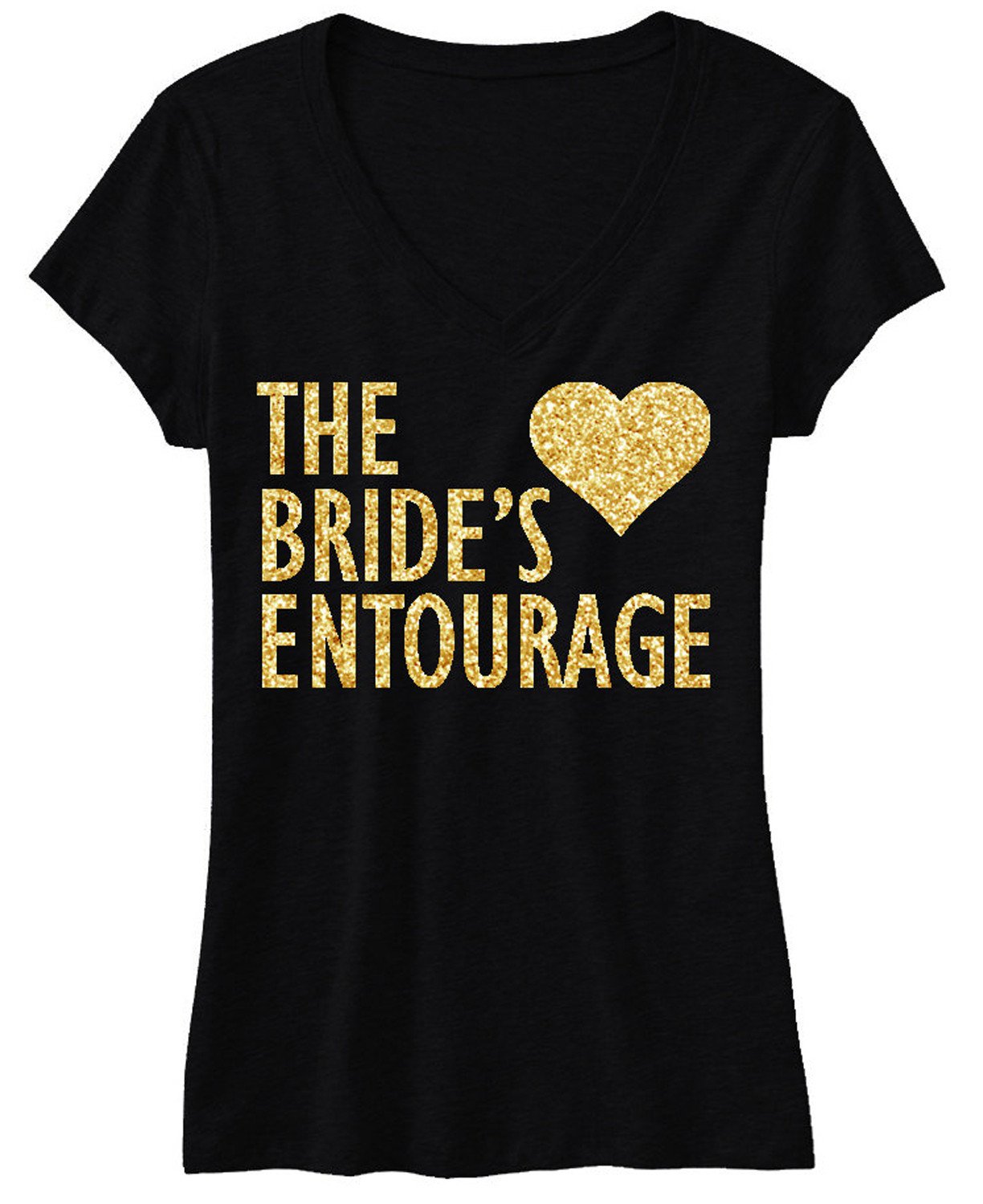 Introducing the BRIDE'S ENTOURAGE Gold Glitter Shirt, a must-have for any bridal party or celebration. This stylish black V-neck shirt features a stunning gold glitter print that adds a touch of glamour to your special day. Made from 100% ring spun cotton, this shirt is not only fashionable but also incredibly soft and lightweight, ensuring comfort throughout your festivities.