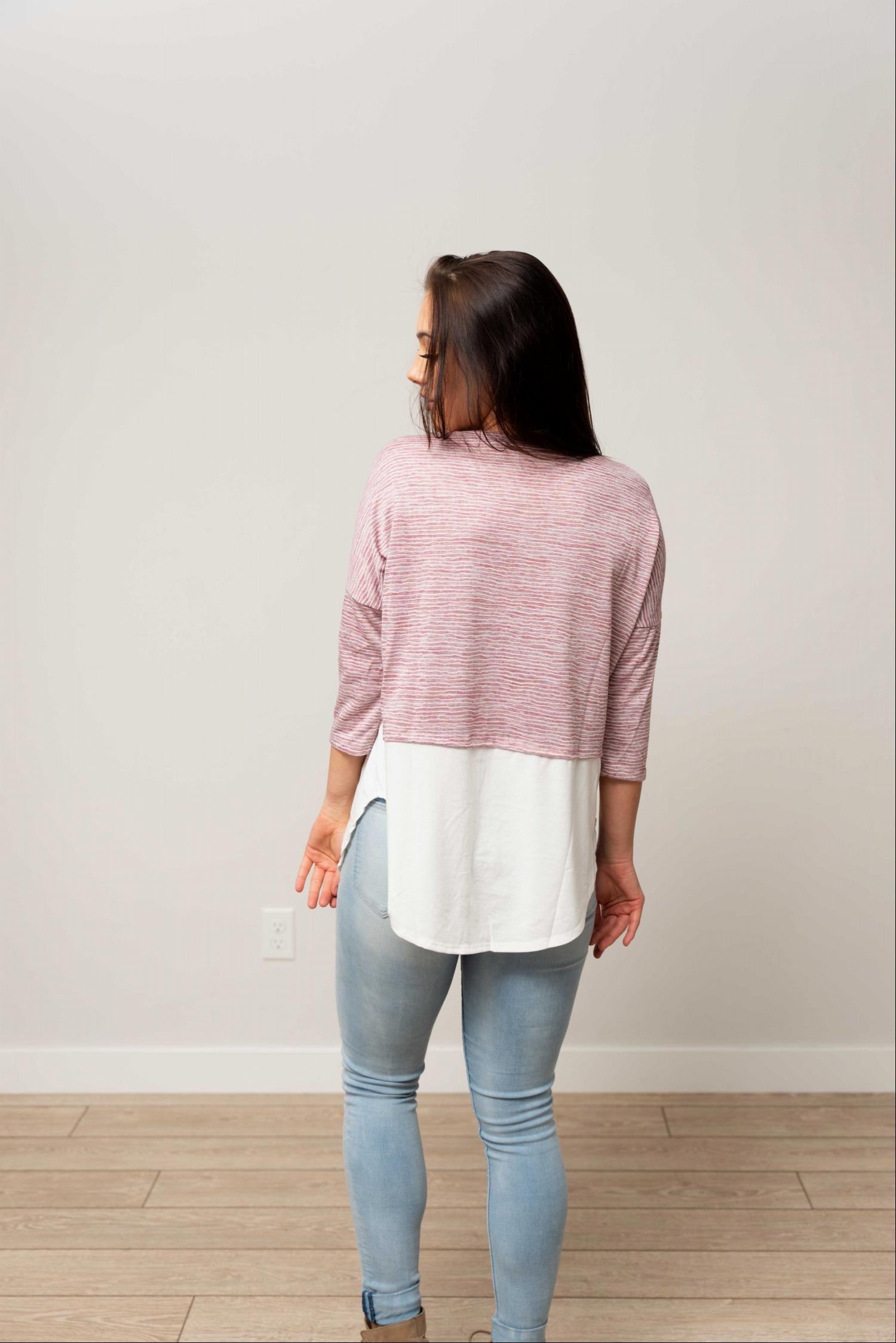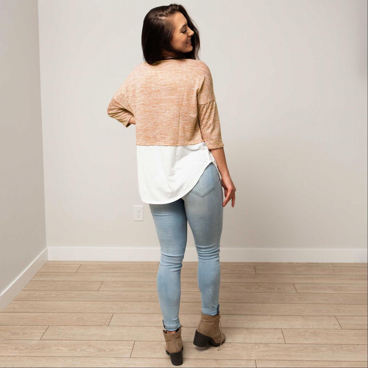 The faux layered design of this knit top is one of its standout features. It allows you to enjoy the trendy layered look without the heaviness that often comes with traditional layered clothing. This makes it a fantastic option for transitioning between seasons, as it can be worn comfortably on its own or layered under a jacket or cardigan.