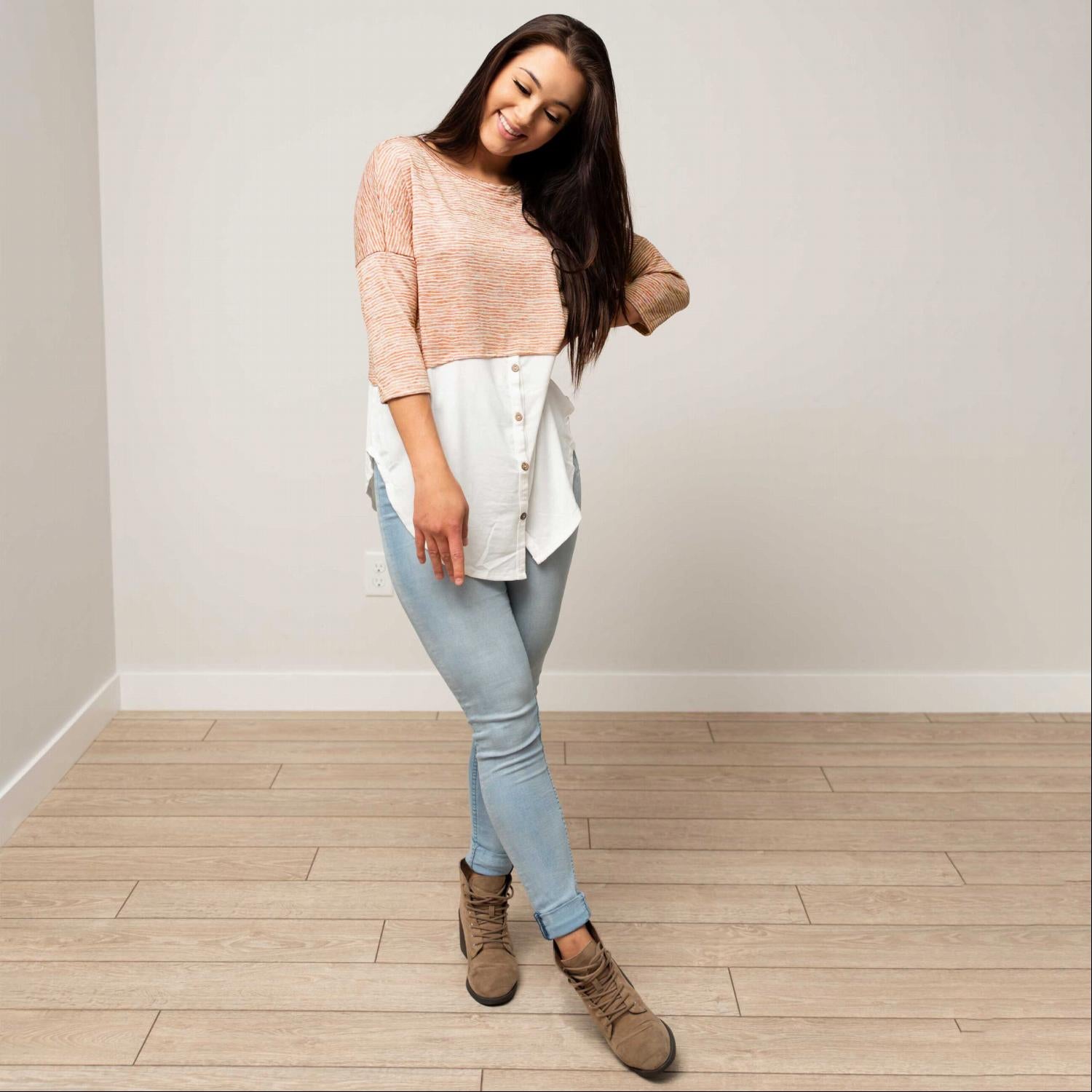 Introducing the Button Down 3/4 Sleeve Knit Top, a perfect blend of style and comfort that every fashion-forward individual needs in their wardrobe. This top features a unique faux layered design that gives the appearance of multiple layers without the added bulk, making it an ideal choice for those who appreciate a sleek silhouette. Crafted from a soft and stretchy fabric, this top ensures all-day comfort while flattering your figure.