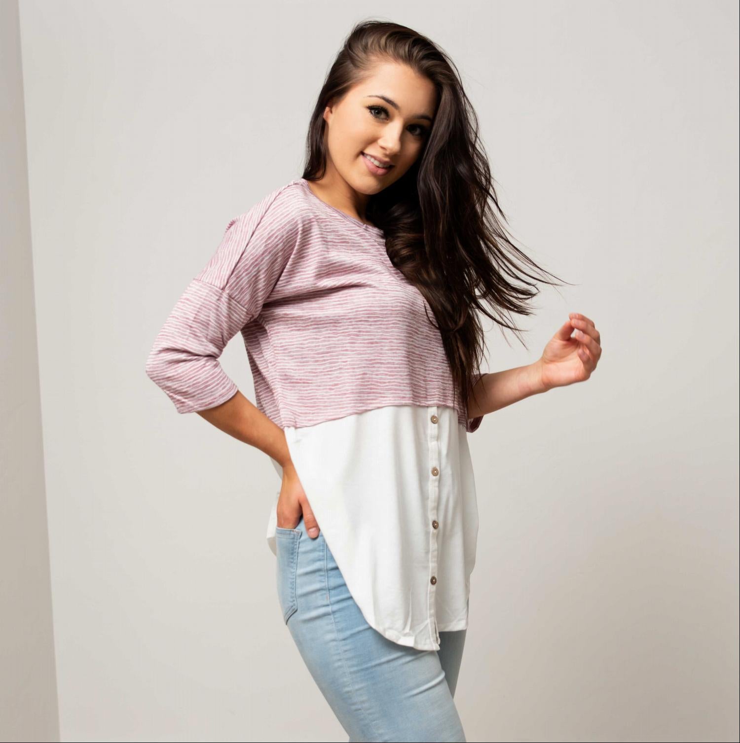 The rounded hemline of this top is designed to enhance your curves, providing a flattering fit that complements various body types. The several buttons lining the top add a touch of elegance and detail, making it suitable for both casual outings and more polished events. Whether you’re dressing it up or down, this top is sure to make a statement.