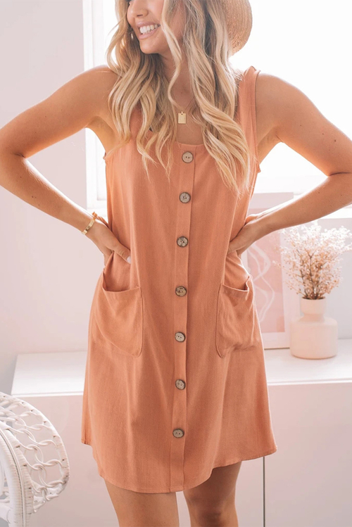 •This relaxed mini dress features a square neckline, shoulder straps, buttons on the front, and pockets on the side of the skirt