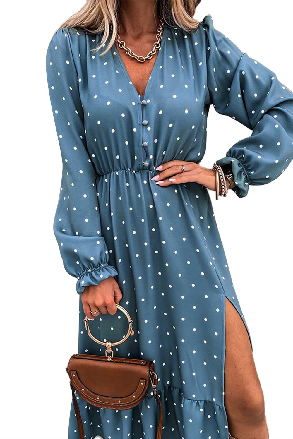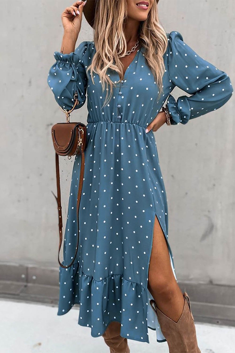 Whether you're dressing for a wedding, a date night, or a casual outing with friends, the Button Polka Dot High Slit Ruffled Midi Dress is the perfect choice. Pair it with heels for a chic look or dress it down with sandals for a more relaxed vibe. This dress is a staple that every girl should have in her wardrobe, offering endless styling possibilities.