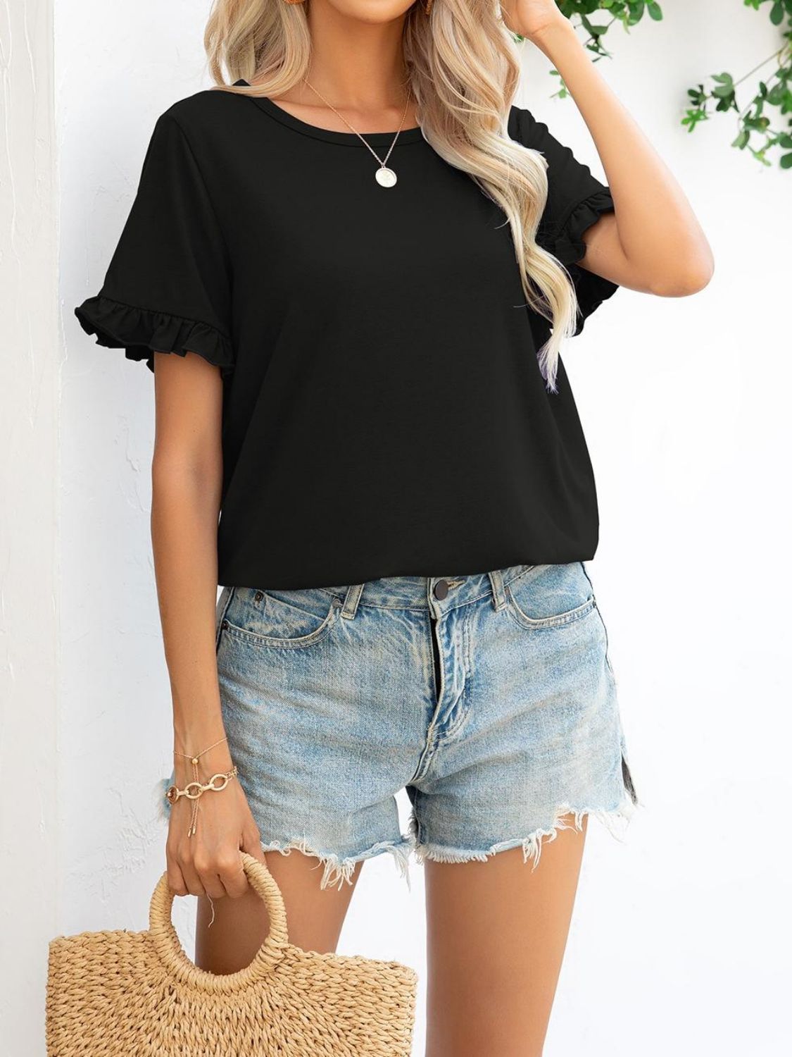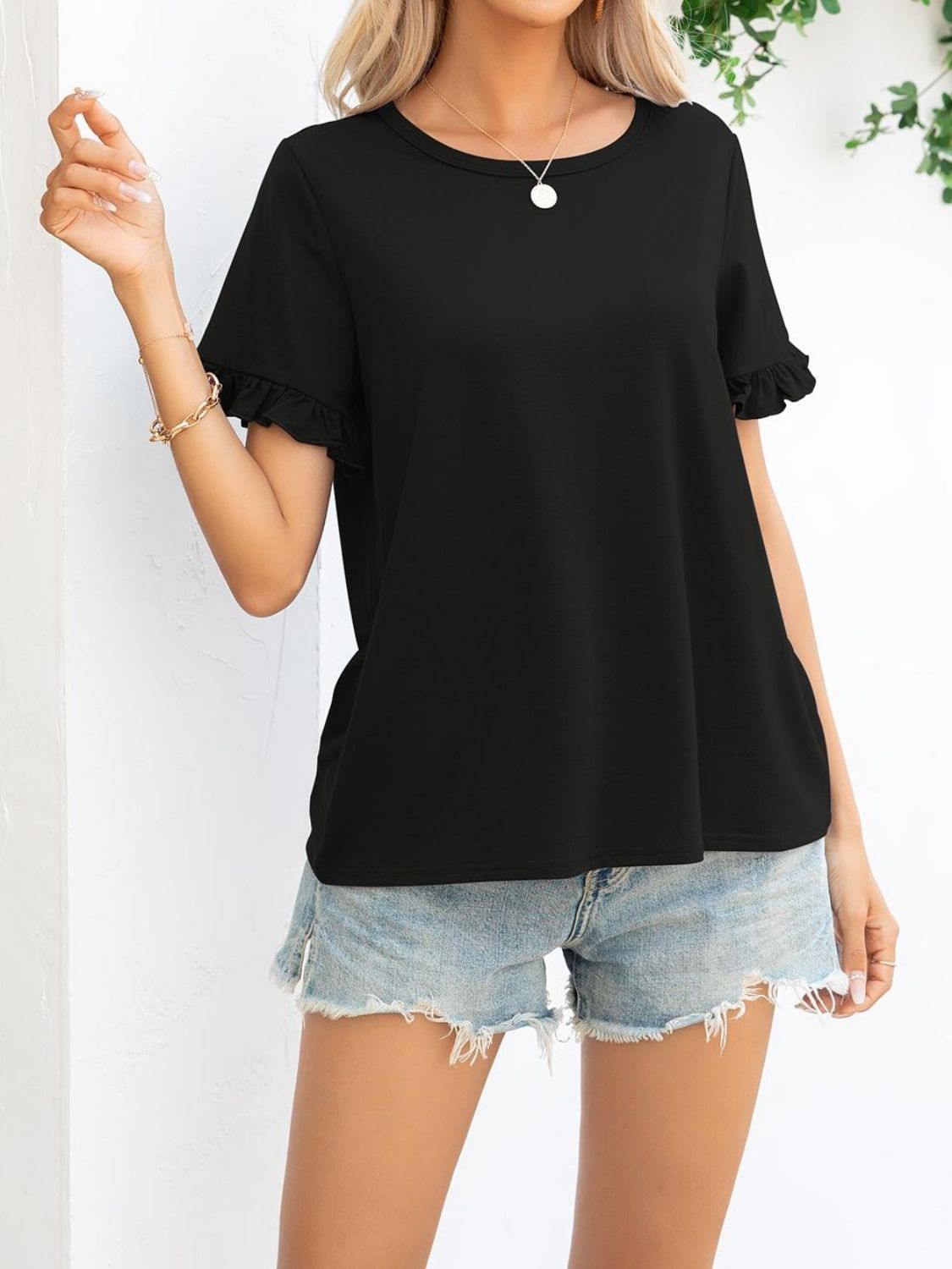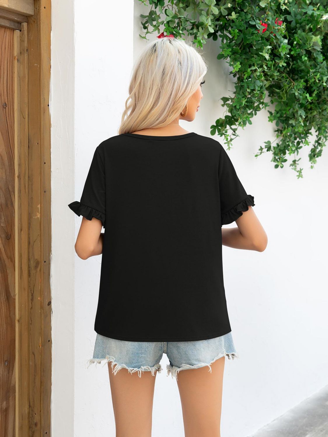 Maintaining the quality of your Camouflage Flounce Sleeve Tee Shirt is easy. Simply machine wash it in cold water and tumble dry on low. This hassle-free care routine allows you to enjoy your stylish tee without worrying about complicated washing instructions.