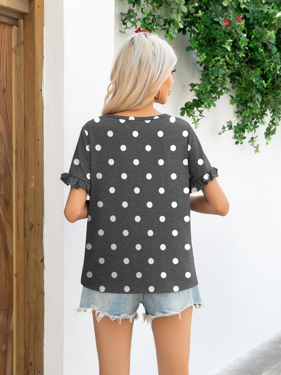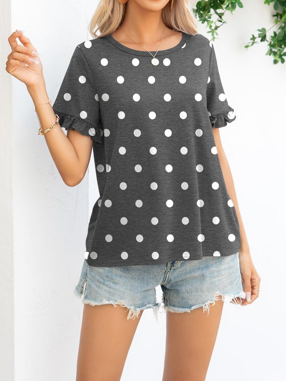 Introducing the Camouflage Flounce Sleeve Tee Shirt, a perfect blend of style and comfort for your casual wardrobe. This tee shirt features a unique camouflage pattern combined with playful polka dots, making it a standout piece for any occasion. Whether you're heading out for a casual day with friends or lounging at home, this tee is designed to keep you looking chic and feeling comfortable.
