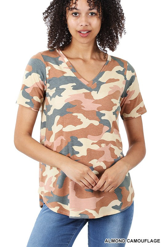 The Camouflage Short Sleeve V-neck Top is available in three trendy colors: green, grey, and almond. This variety allows you to choose the perfect shade that complements your personal style. Pair it with your favorite jeans or dark-colored pants for a complete look that is both fashionable and effortless.