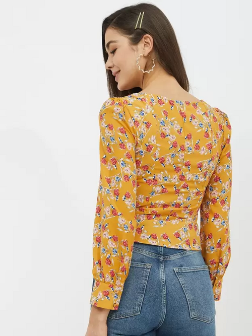 Casual Regular Sleeves Printed Women Mustard Top (Size L)