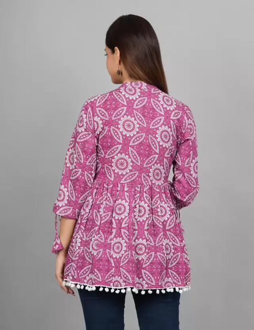 The casual regular printed women's top combines comfort with style effortlessly. Made from lightweight, breathable fabric, it's perfect for everyday wear. The vibrant print adds a touch of personality, making it easy to pair with jeans or skirts for a relaxed yet fashionable look. Ideal for both work and weekend outings, this top is a versatile addition to any wardrobe, offering both comfort and chic appeal.