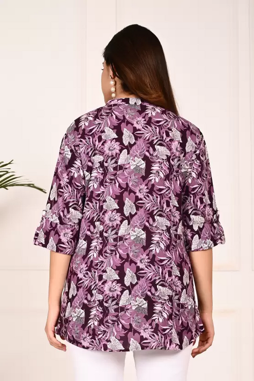 Casual Roll Up Sleeves Printed Women Purple Top (Size XL)
