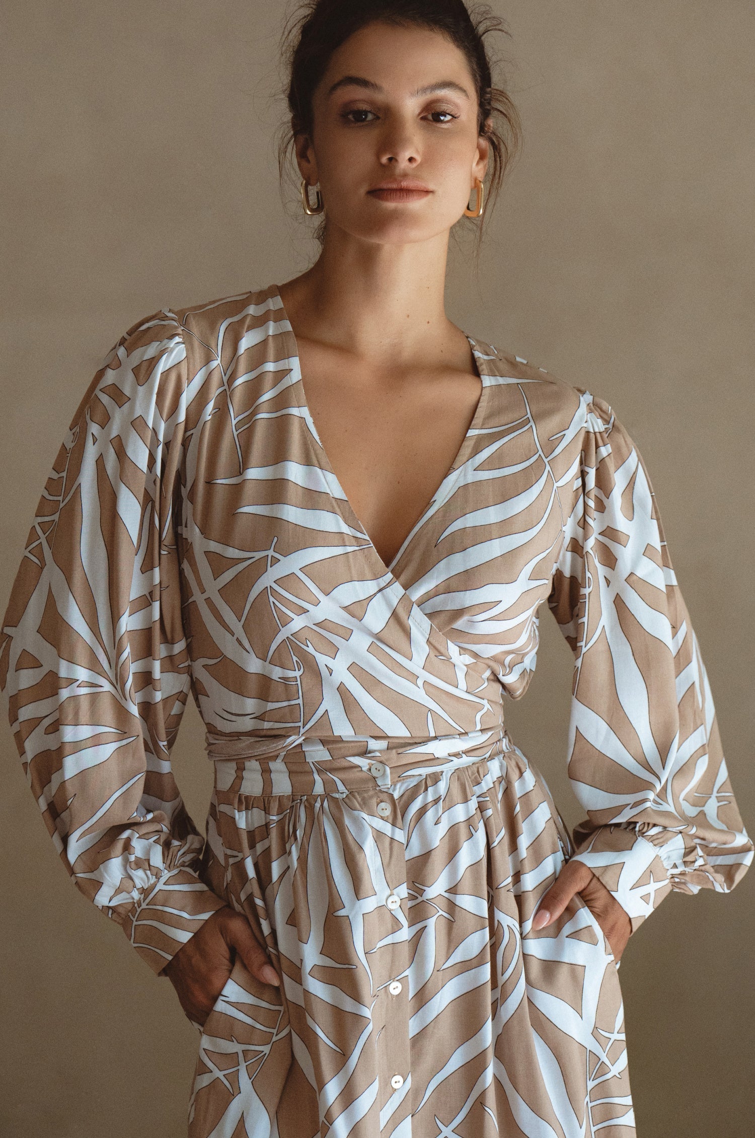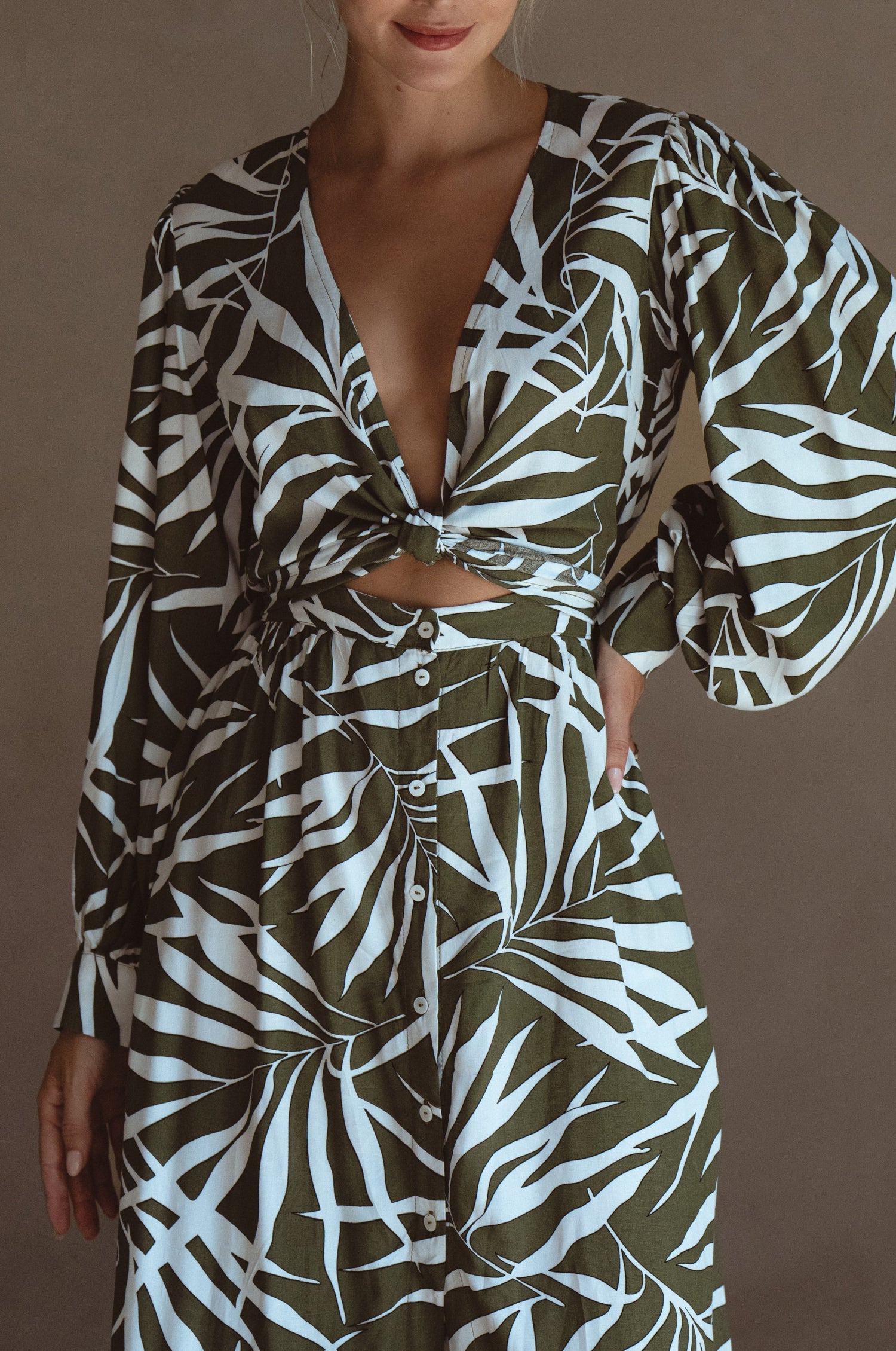 Celeste Convertible Midi Dress in soft rayon, featuring long sleeves and a button-down design, styled for a chic look.
