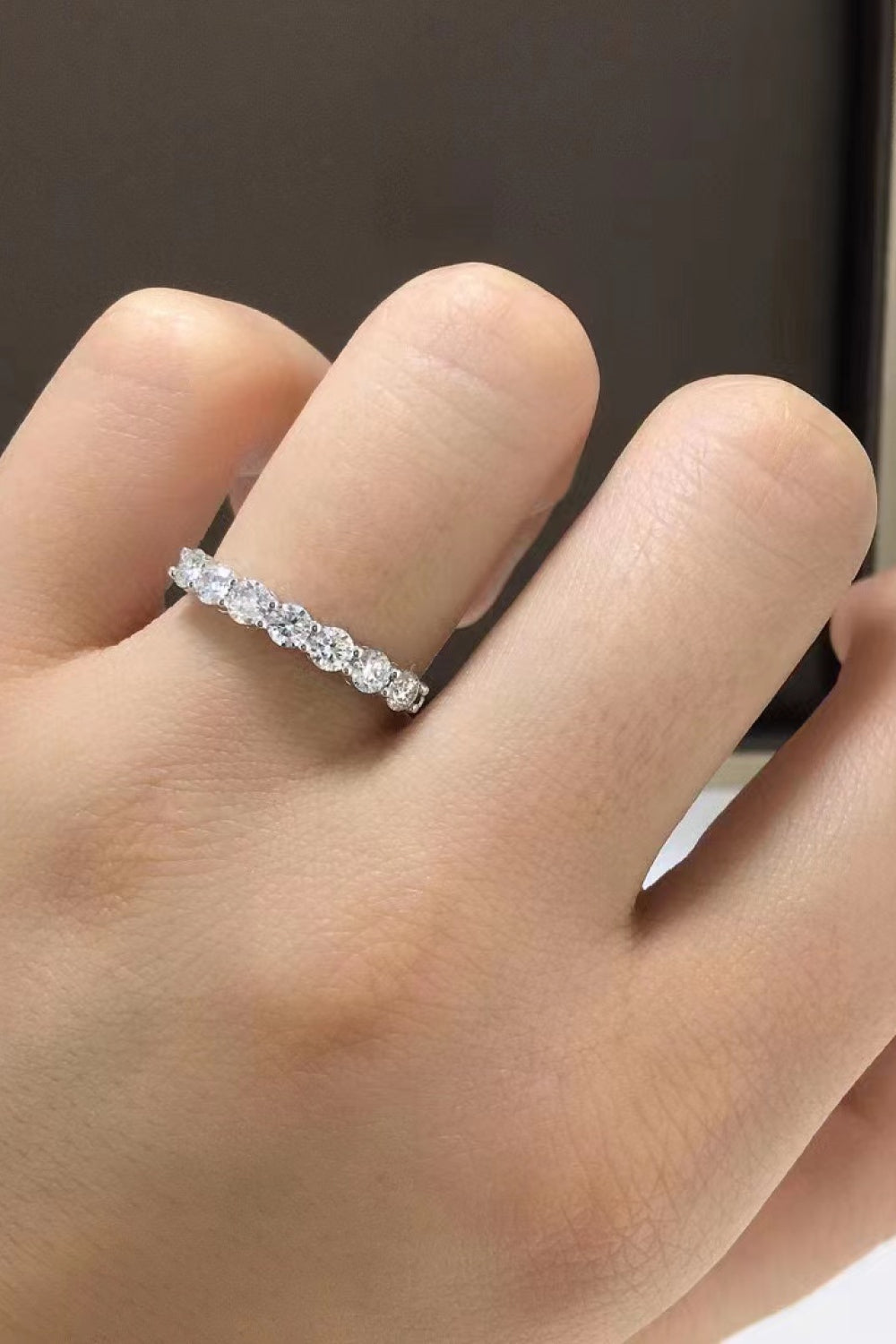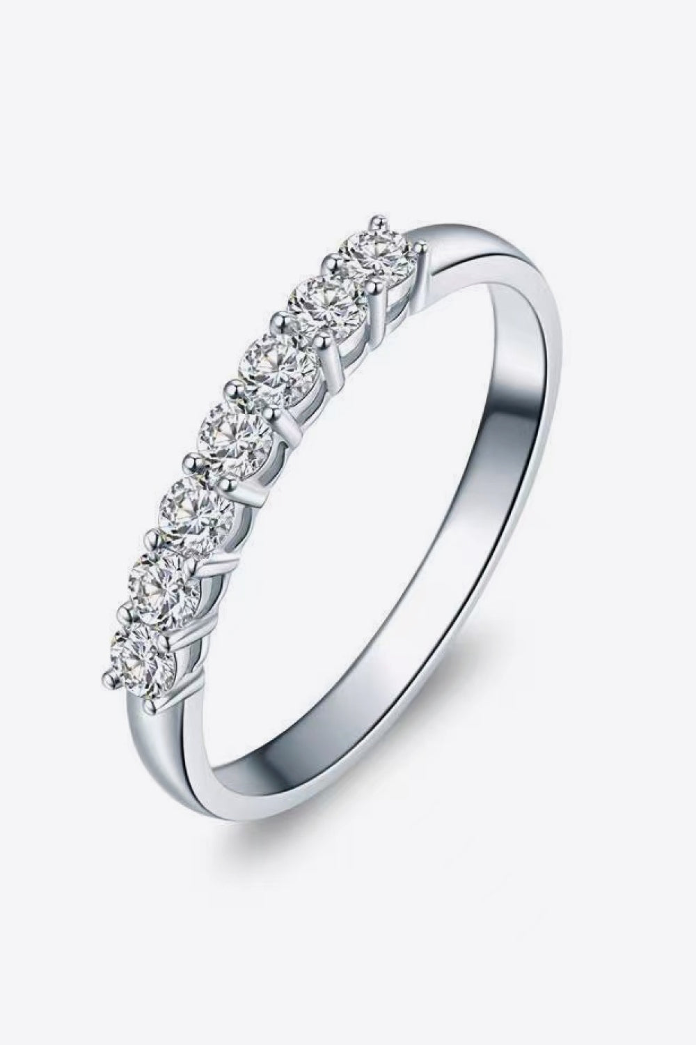 Charming Moissanite 925 Sterling Silver Ring displayed in a flat lay style, showcasing its polished finish and round moissanite centerpiece.