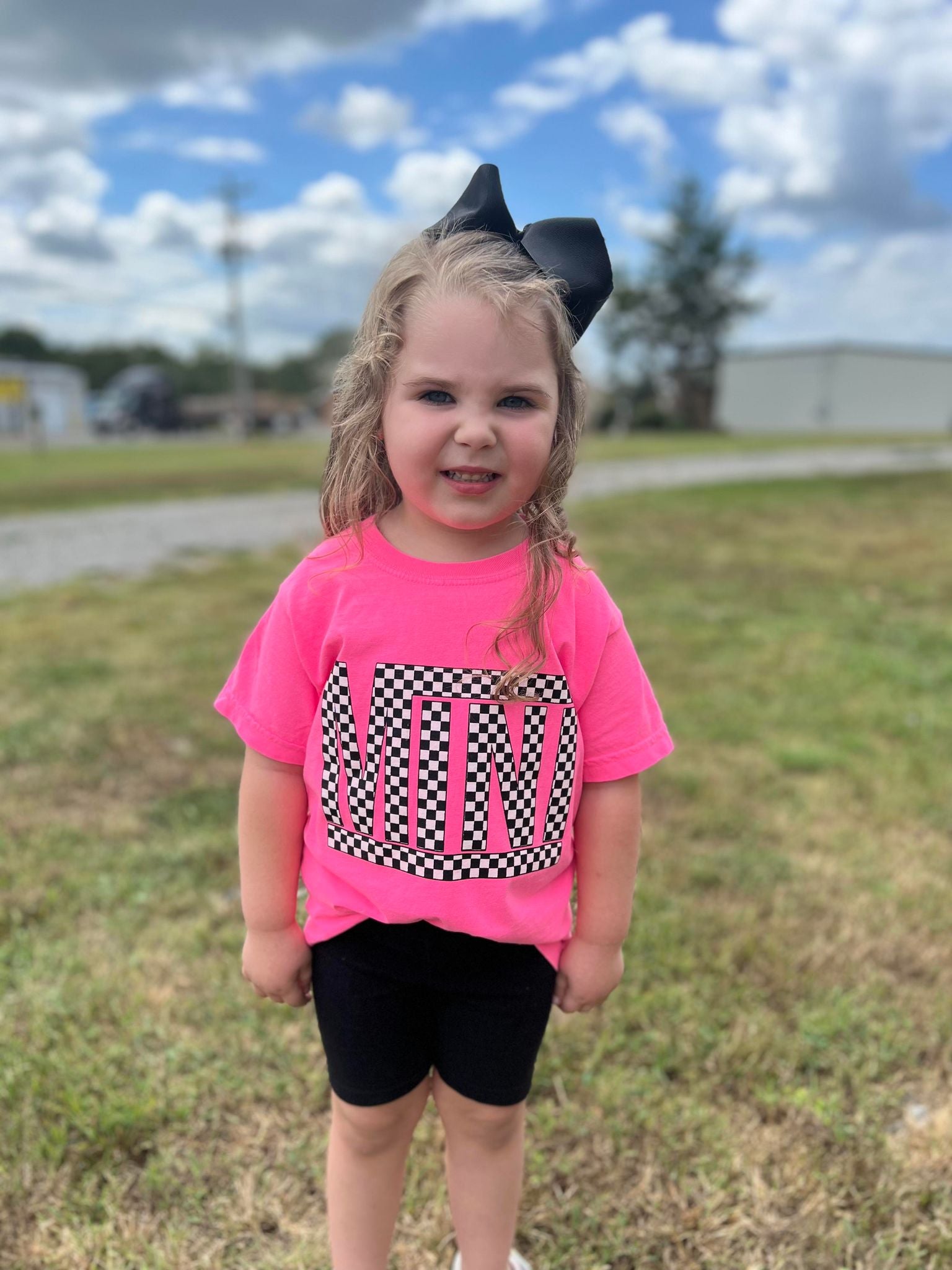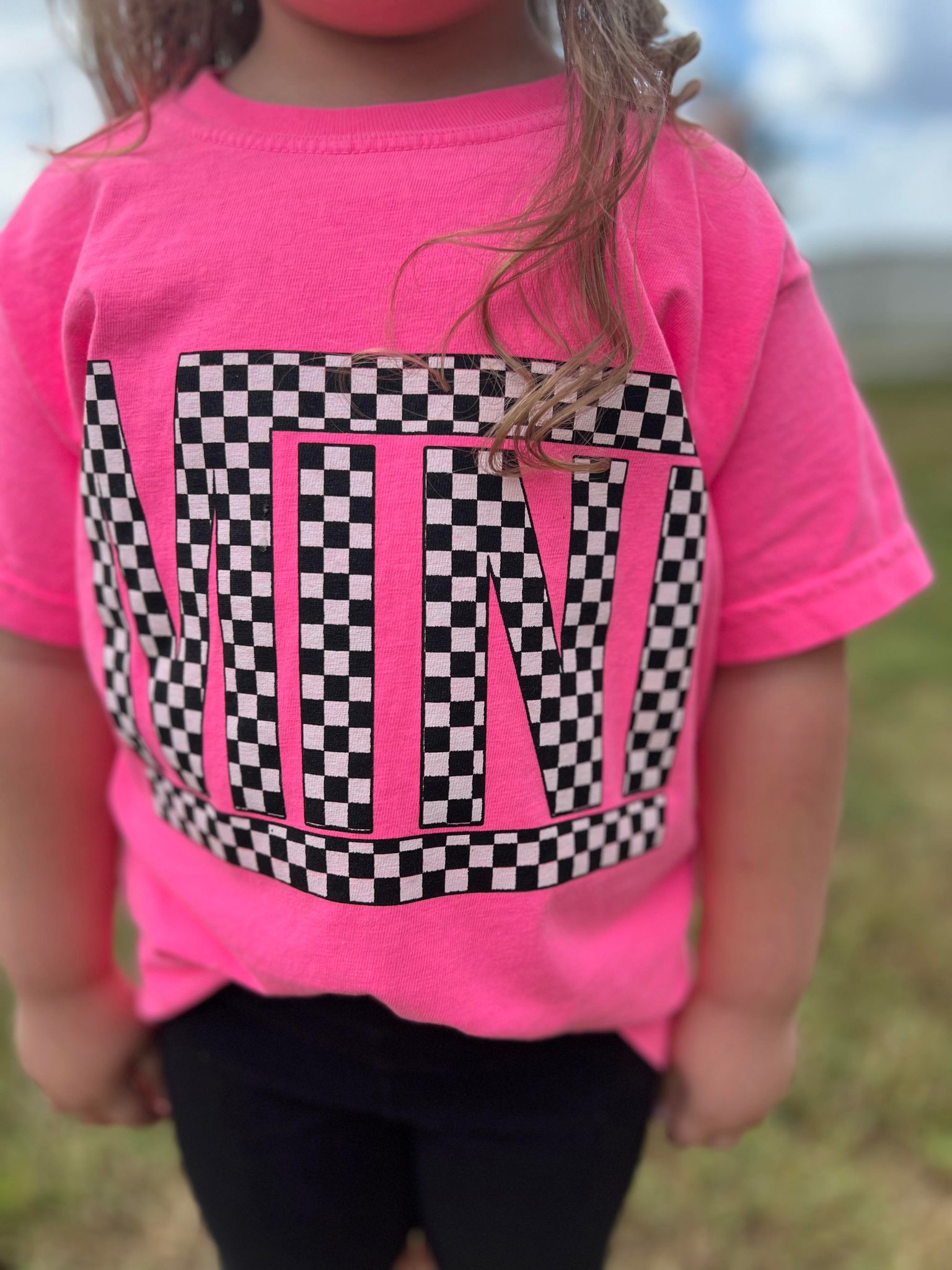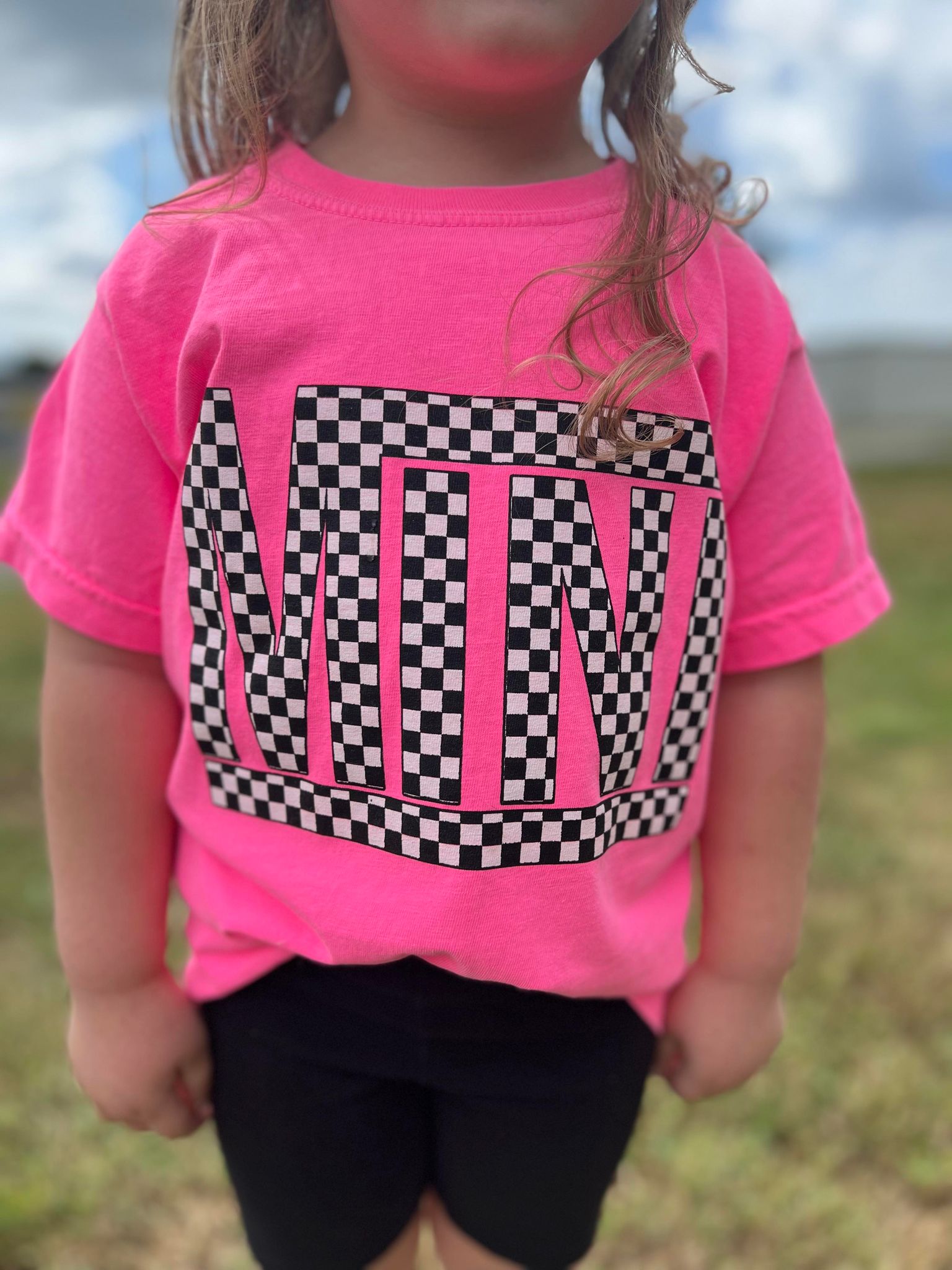 Introducing the Checkered Mini Youth Pink Tee, the perfect addition to your child's wardrobe! This stylish tee allows you to match with your little one, making it a fantastic choice for family outings, playdates, or casual days at home. With its vibrant neon pink color, this tee is sure to stand out and make a statement.
